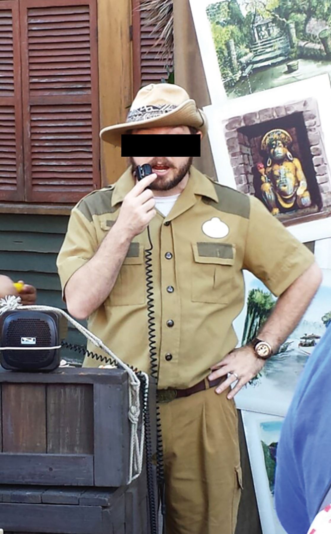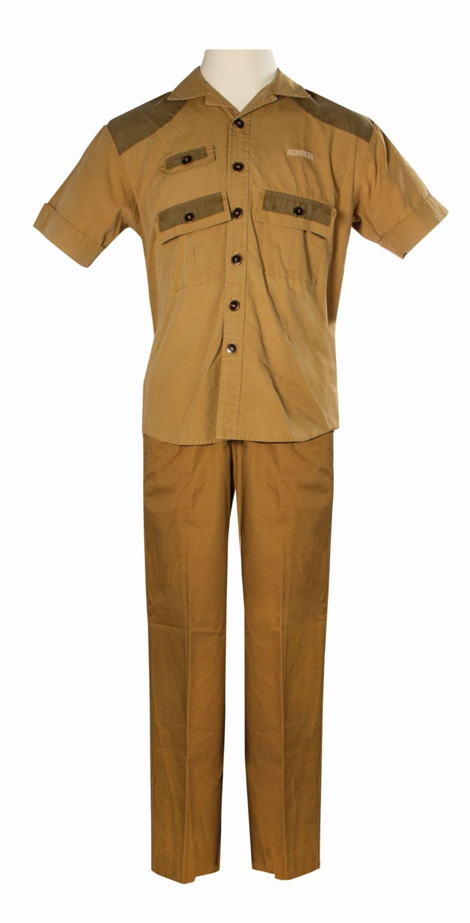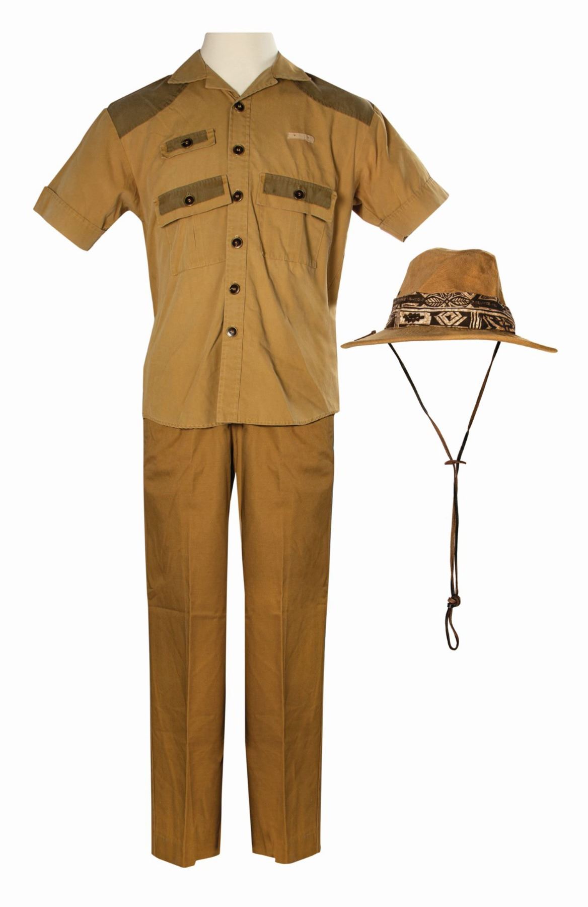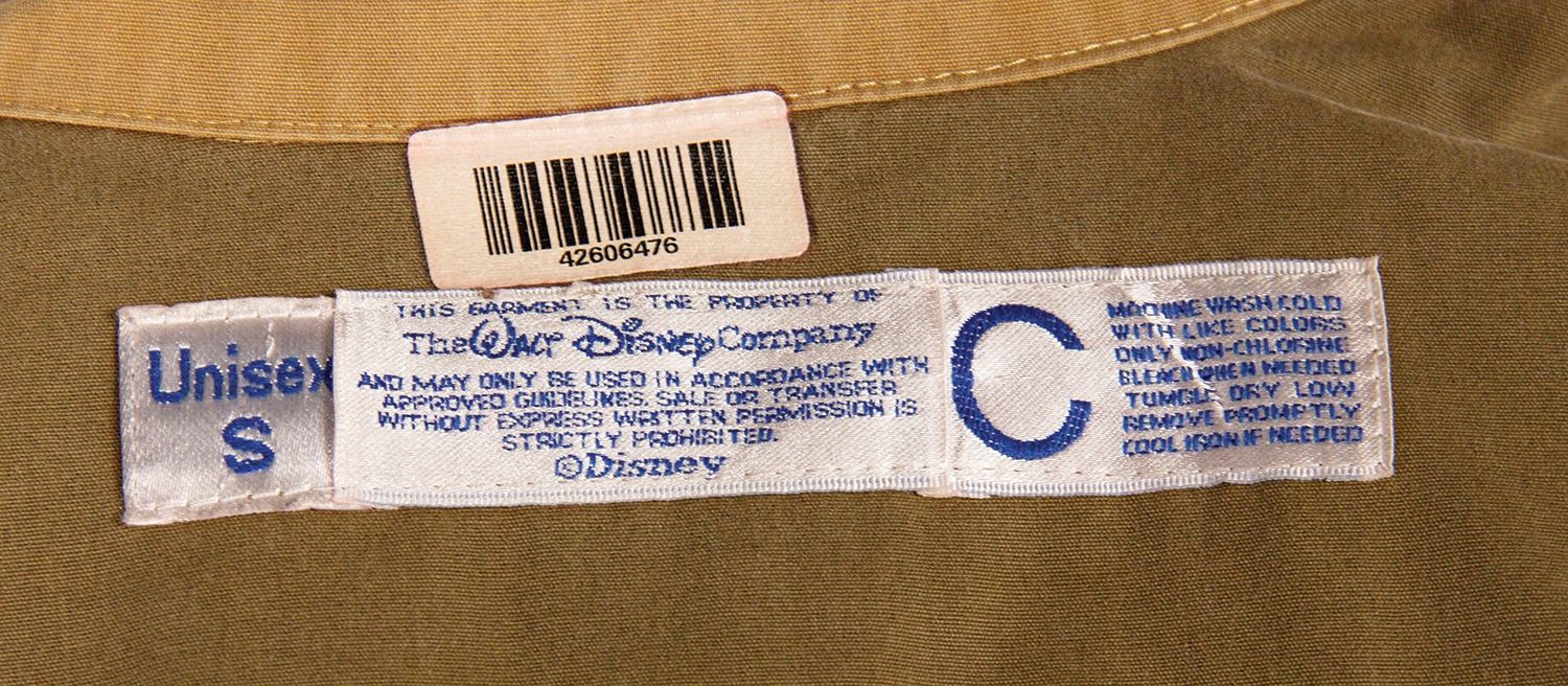 (Disneyland, 2010s) A rare complete cast member costume for the Jungle Cruise attraction. The costume includes the pocketed shirt, pants, and a hat. The shirt is a size unisex S and the pants are a men's size 32/32. The hat is a size XL. The condition is very good with some wear from use and the clothing retains the original Disney wardrobe services tags.