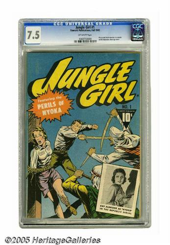 <B>Jungle Girl #1 (Fawcett, 1942) CGC VF- 7.5 Off-white pages.</B></I> According to Overstreet, this is the first comic book to devote its entire contents to a movie serial adaptation. The character is perhaps better known to comic fans as Nyoka the Jungle Girl, and the series would be called by that name starting with the second issue. This first issue has a bondage cover as well as an inset photo of star Kay Aldridge. Overstreet 2005 VF 8.0 value = $819. CGC census 5/05: 1 in 7.5, 3 higher.