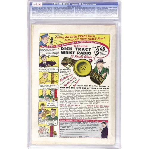 <B>Junior #10 (Fox Features Syndicate, 1947) CGC VF- 7.5 Cream to off-white pages.</B></I> "Headlights covers on all" is Overstreet's notation for this series' run, and while Al Feldstein did some great things in his career, some would argue that he never topped his 8-issue run on <B>Junior</B></I>. He didn't stop with the cover, either - our resident Feldstein expert tells us that the interior has "plenty of lingerie panels and remarkably sexy artwork." This is the nicest copy we've seen for sale in any venue. Overstreet 2006 VF 8.0 value = $506. CGC census 5/06: 1 in 7.5, 2 higher. <BR><BR><B>Important notice:</B> Heritage usually auctions material at the rate of 200-250 lots per hour. On some occasions eBay Live bid software or the Internet may not be able to keep up with the pace of the auction. We recommend placing a realistic absentee bid now as insurance to avoid disappointment. Occasionally the auctioneer may eliminate or reject an eBay Live bid, and the auctioneer may also reopen a lot after the close of the eBay live bidding (usually because we missed an audience bid), and may reject your bid even if it shows you as the winning bidder. By bidding via eBay Live, you agree that Heritage may award the lot to another bidder at its sole discretion under the circumstances described above or any other reasonable circumstances. Since eBay bids are not shown to us until we open the lot on the floor, we treat those bids just like floor bids. In most cases the floor responds before the eBay bid is presented to us, due to Internet lag time, so for consistency we have made it a policy that floor bids are always considered first over tie eBay live bids. Also please note that all Heritage lots purchased through eBay Live carry a 22.5% Buyer's Premium. Please make sure you read the Terms and Conditions before you bid. This lot is being auctioned in conjunction with a live floor auction by Heritage Auction Galleries. All final auction and invoice information will be supplied by Heritage Auction Galleries, and all other information should be considered preliminary. Lot:41001 <BR><BR><B>Winning Notification and Billing:</B> After the FINAL session in this auction is complete, Heritage will send e-mail and snail mail invoices. This process normally takes several days. All final auction and invoice information will be supplied by Heritage Auction Galleries, and all other information should be considered preliminary. <BR><BR>This auction will be conducted on a live auction floor and over the Internet through eBay Live. If you choose to place an absentee bid, please take a moment to <font color='#0000ff'><u><a href='http://pages.ebay.com/liveauctions/help/before/laabsentee.html'>learn how eBay Live absentee bidding works</a></u></font><font color='#000000'>