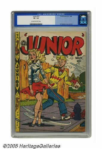 <B>Junior #12 (Fox Features Syndicate, 1948) CGC VF- 7.5 Cream to off-white pages.</B></I> Here's another glorious 'headlight" cover from Al Feldstein, and one of three covers in the series to take place in front of that same wooden fence. If we knew of a place with so many gorgeous girls (and so many gusts of wind) we'd be hanging out there too! If you're not familiar with Junior, suffice it to say that he was basically a takeoff on Archie, but done in Fox Features' typically lurid manner. The glimpse of a young lady's slip is pretty racy stuff for the 1940s. All of the interior art is by Feldstein as well. Overstreet 2005 VF 8.0 value = $494. CGC census 4/05: 2 in 7.5, none higher.