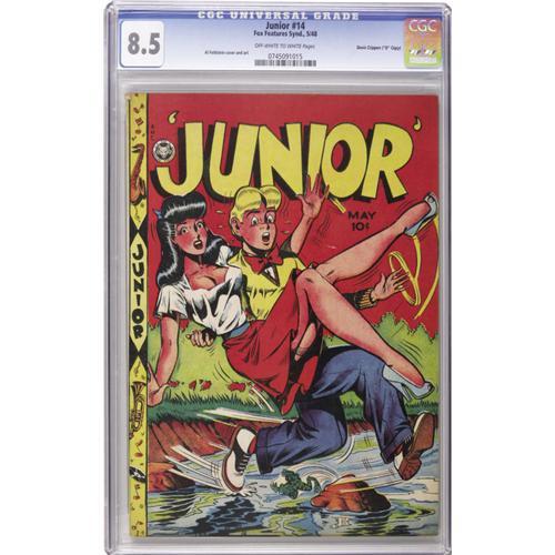 <B>Junior #14 Davis Crippen ("D" Copy) pedigree (Fox Features Syndicate, 1948) CGC VF+ 8.5 Off-white to white pages.</B></I> The last time we were fortunate enough to have a high-grade copy of this book it fetched several times Guide, and we expect similar results for the Crippen copy. Al Feldstein under his pen name "Bill Brown" handled the art chores on this inspired cover. Overstreet 2006 VF 8.0 value = $506; VF/NM 9.0 value = $803. CGC census 10/06: 4 in 8.5, none higher. <I>From the Crippen Collection</B></I>.<BR><BR><b>Shipping:</b> Slabbed Comic (<a target="_blank" href="http://www.heritageauctions.com/common/shipping.php">view shipping information</a>)