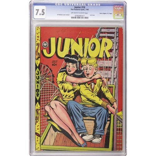 <B>Junior #16 Davis Crippen ("D" Copy) pedigree (Fox Features Syndicate, 1948) CGC VF- 7.5 Off-white to white pages.</B></I> If you've been keeping abreast of trends in collecting, you know that the titular hero is not the reason people love this book, rather it's the girls who appear on the covers and in the stories. Alas, the series went bust after this final issue. Al Feldstein of later <B>Mad</B></I> fame was responsible for the cover and interior art. Overstreet 2006 VF 8.0 value = $506. CGC census 10/06: 1 in 7.5, 3 higher. <I>From the Crippen Collection</B></I>.<BR><BR><b>Shipping:</b> Slabbed Comic (<a target="_blank" href="http://www.heritageauctions.com/common/shipping.php">view shipping information</a>)