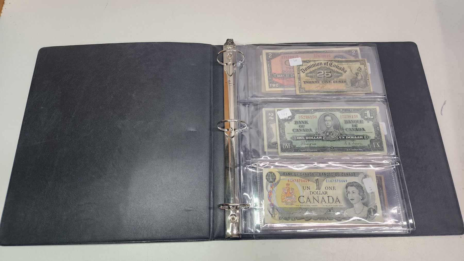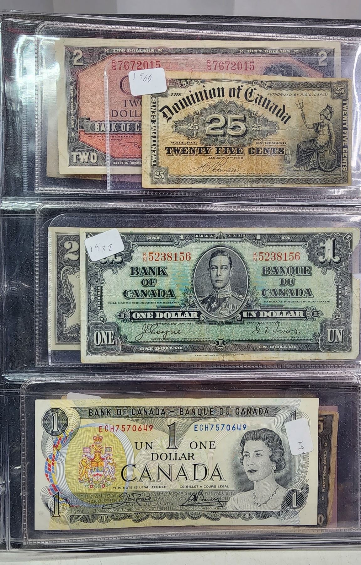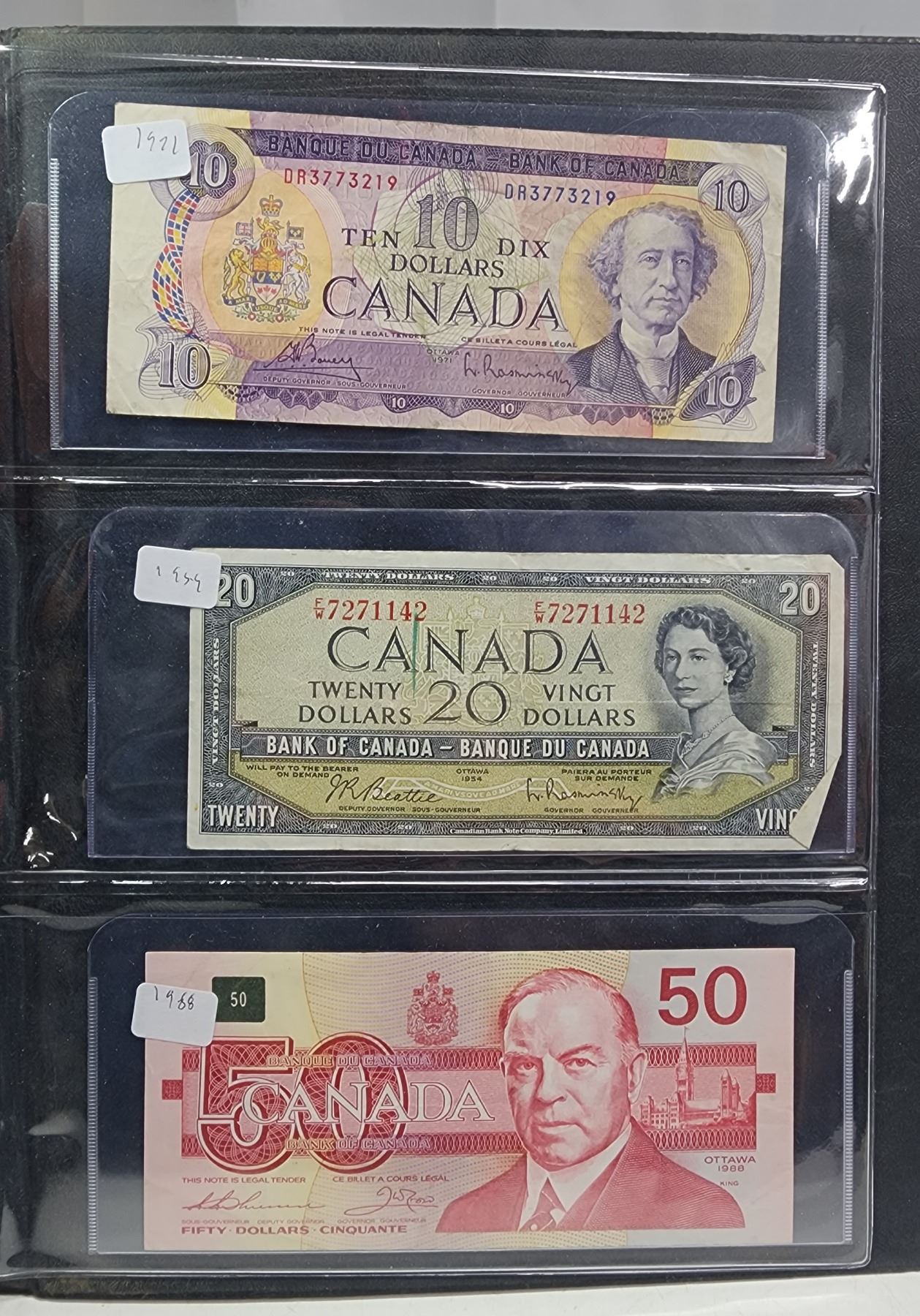Junior Collection of 9 Canadian & US bills - assorted years - Shinplaster, 1, 2, 2 dollar US, 5, 10, 20 & 50 dollar bills