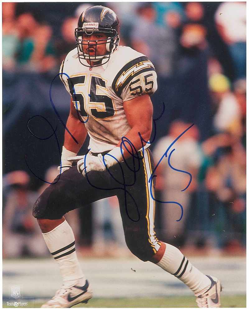 Color glossy 8 x 10 photo of Seau on the field for the San Diego Chargers, signed in blue felt tip. In fine condition, with some light contrast to portion of signature.