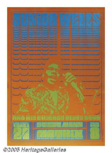 <B>Junior Wells Matrix Poster (Second Printing) (1966).</B></I> Fans of Chicago-style blues will want to take a look at this concert poster promoting the December 27, 1966-January 8, 1967, shows by Junior Wells and his Chicago Blues band (along with opening act Steve Mann) at the legendary Matrix in San Francisco. The poster is a second printing, green and blue on an orange background, in Fine condition, and is a trippy blast from the past.