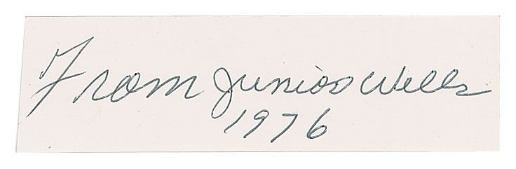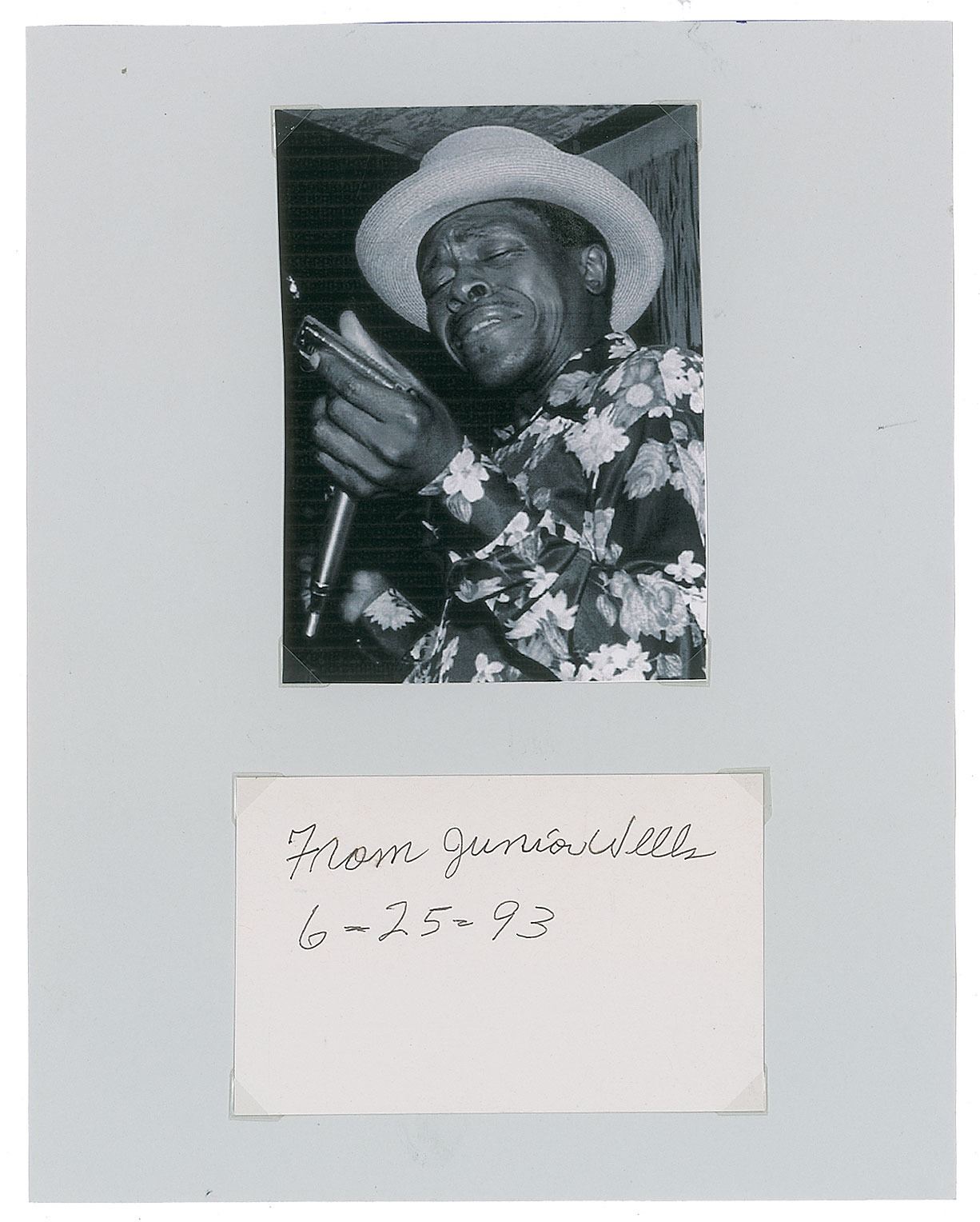 Chicago blues vocalist and harmonica player (1934-1998). Two ink signatures, both signed "From Junior Wells," one on an off-white 4.75 x 3 card dated "6–25–93," and the other on an off-white 5 x 1.5 slip dated "1976." The card is removably corner-mounted to a display sheet with an image of Wells. In overall fine condition.