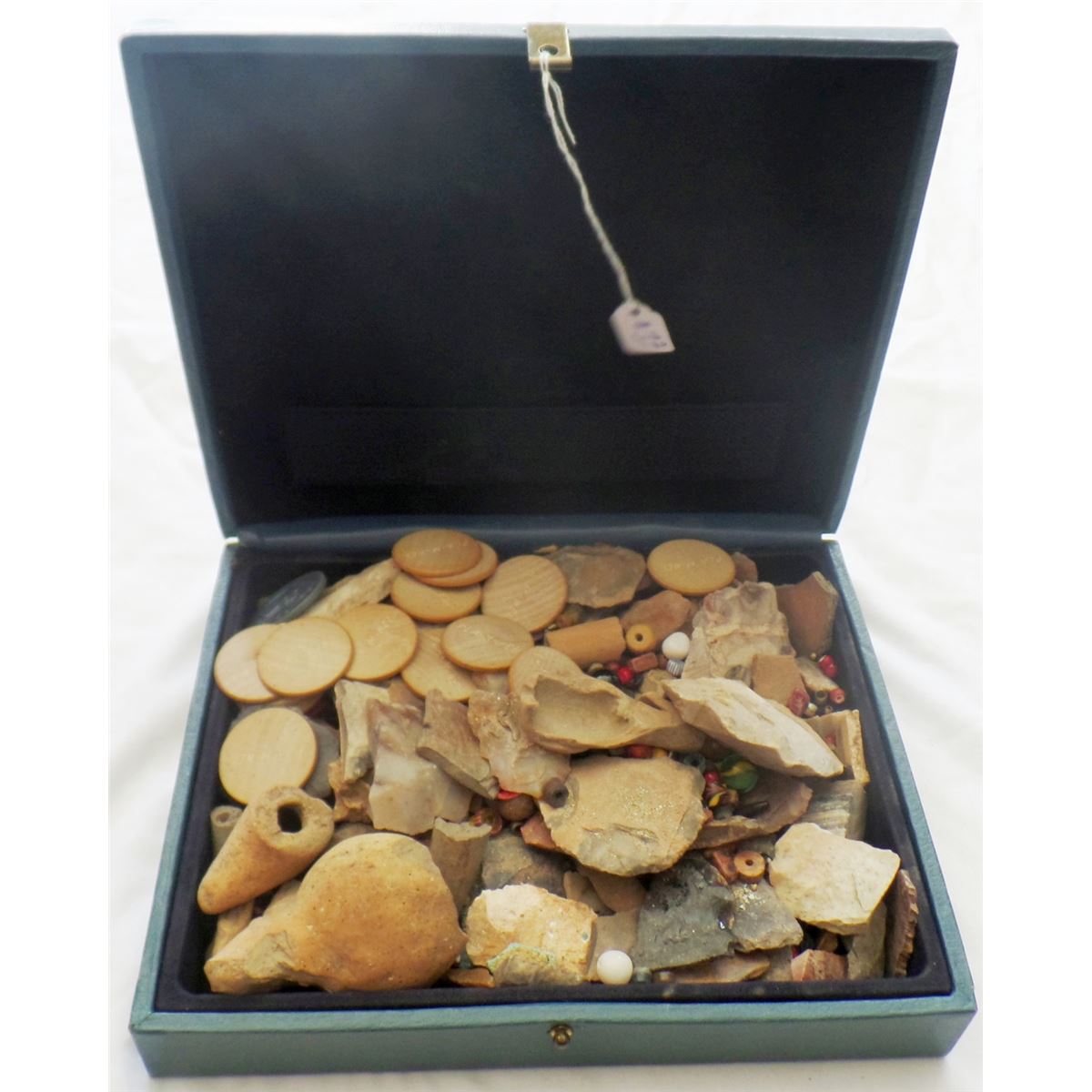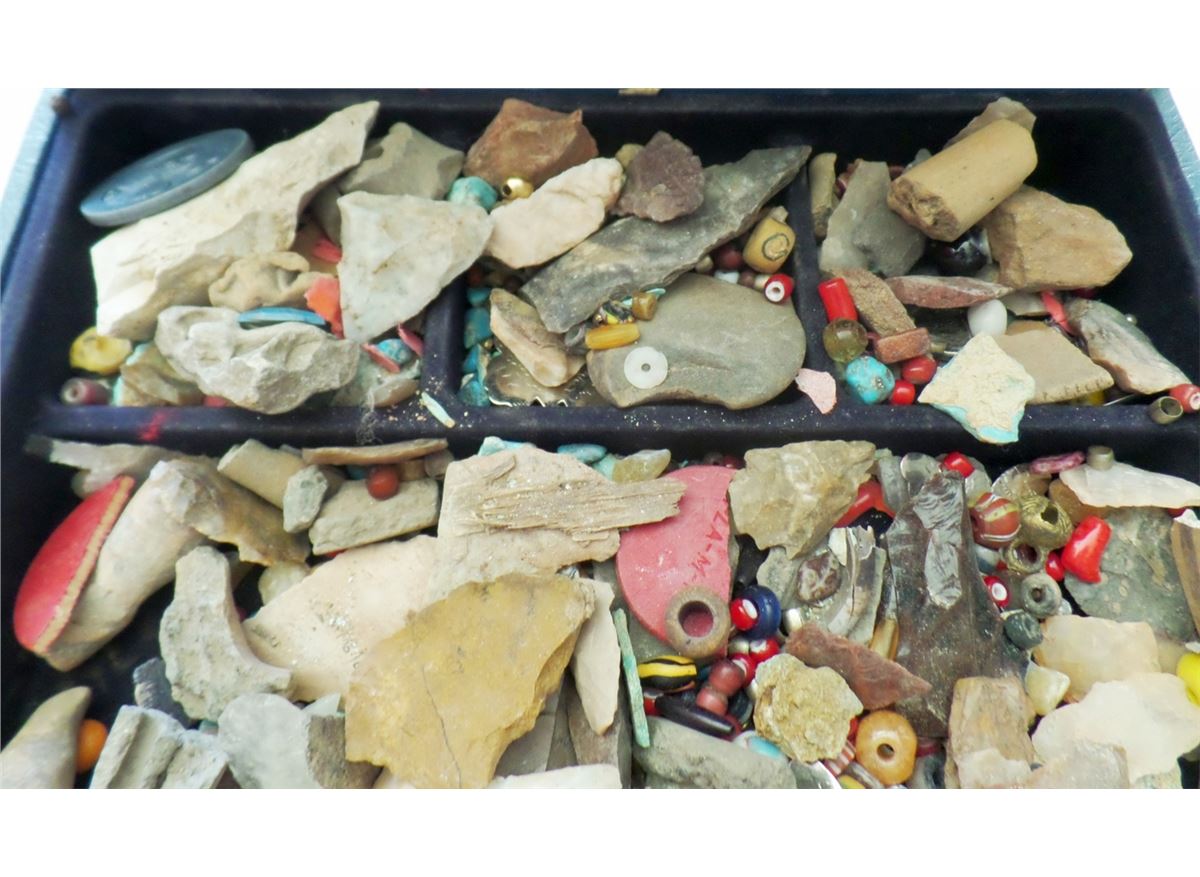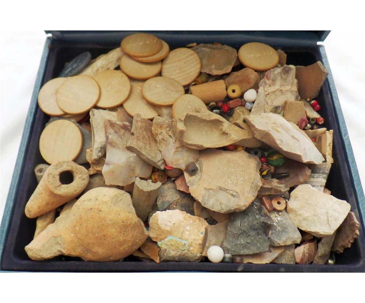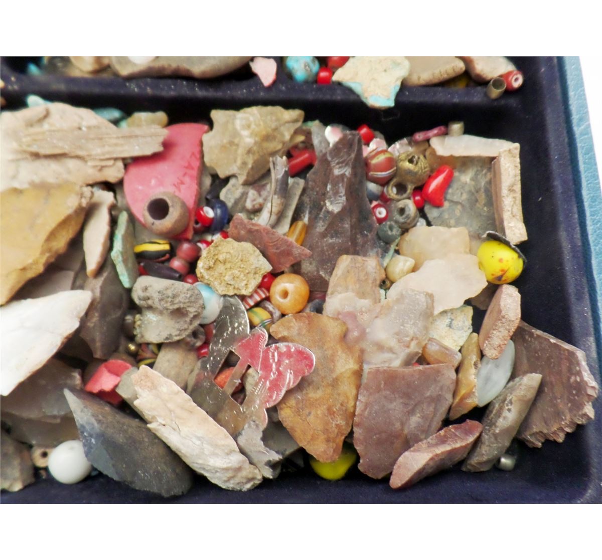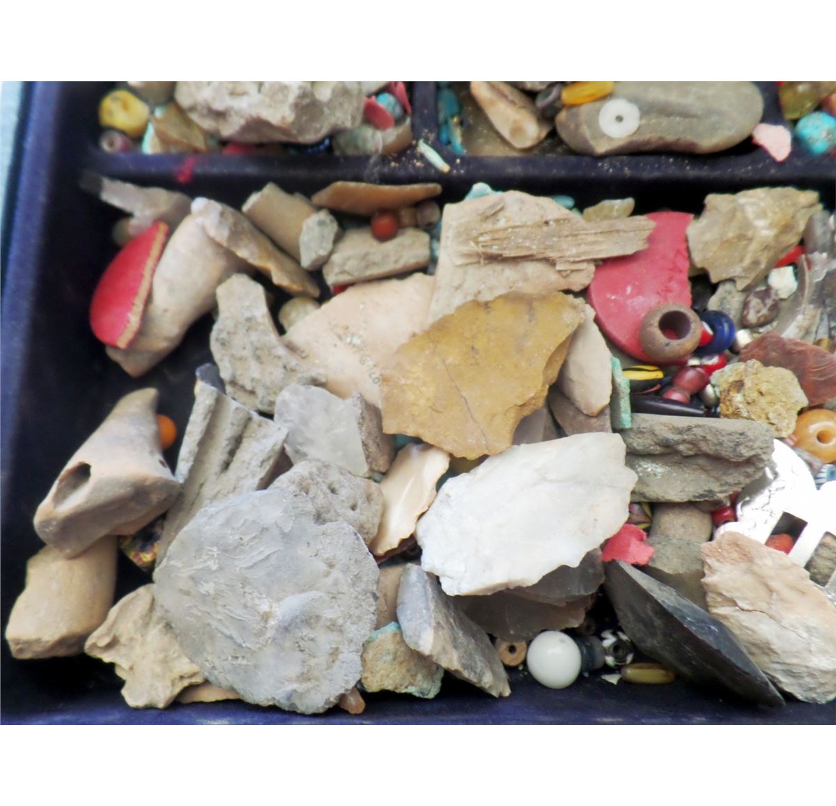 Junk Drawer Artifact Lot. Prehistoric to contemporary period. Includes flint, clay and glass. Box containing items measures 10" x 8" 2". Artifacts are either from the Southwest or Mexico. Hundreds of broken arrowheads, Pre-Columbian ceramics, scrapers, beads, wooden poker chips, etc. Condition: Mostly damaged, see images. Shipping: $15.