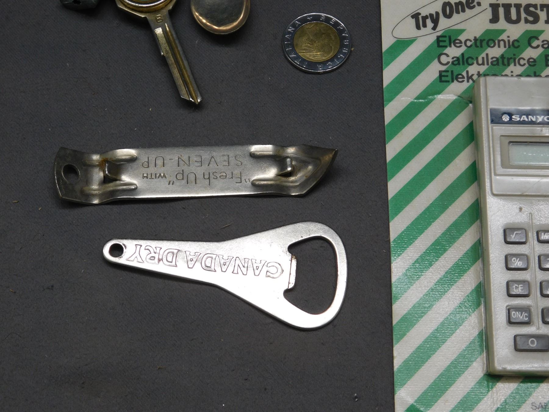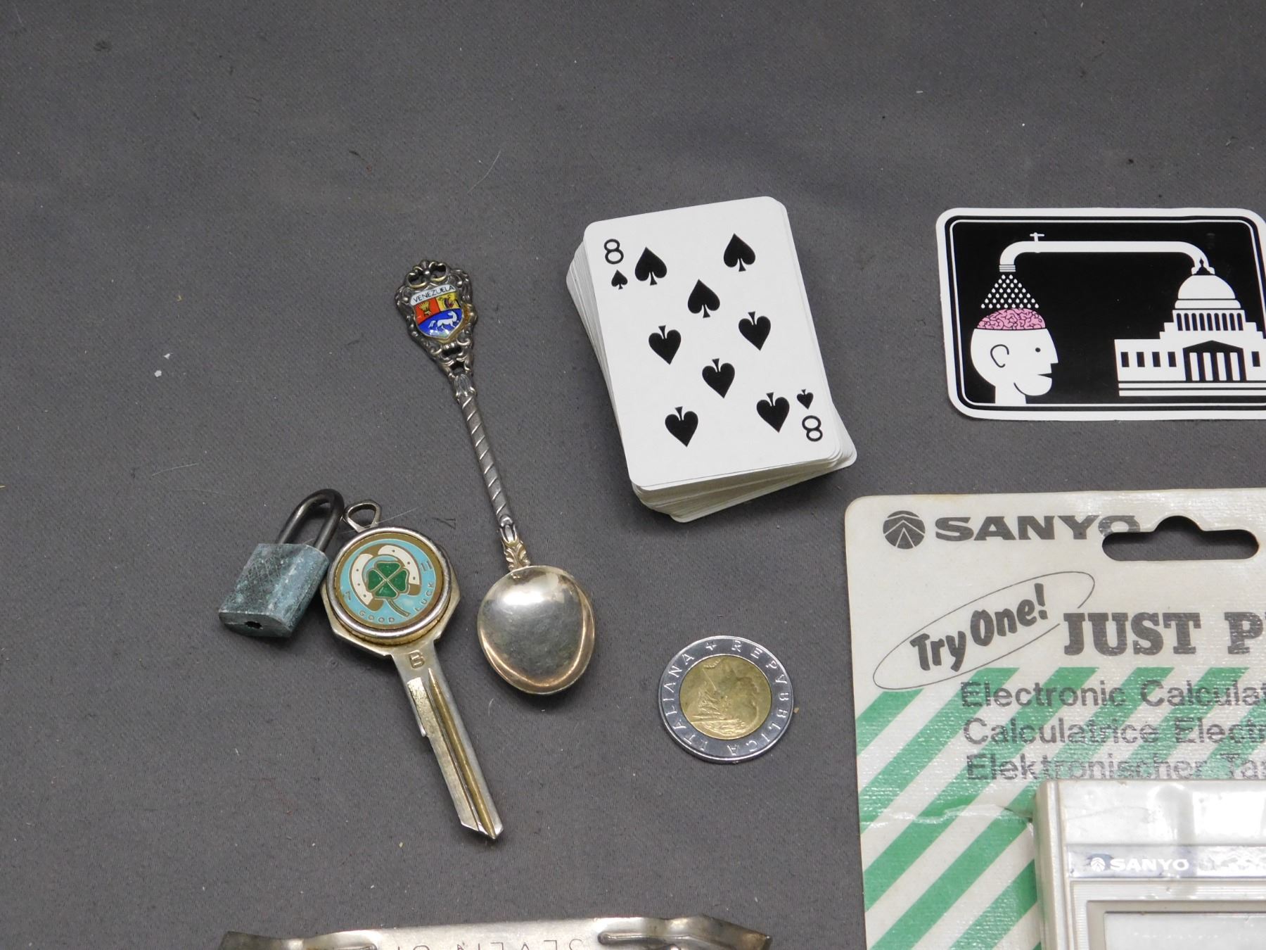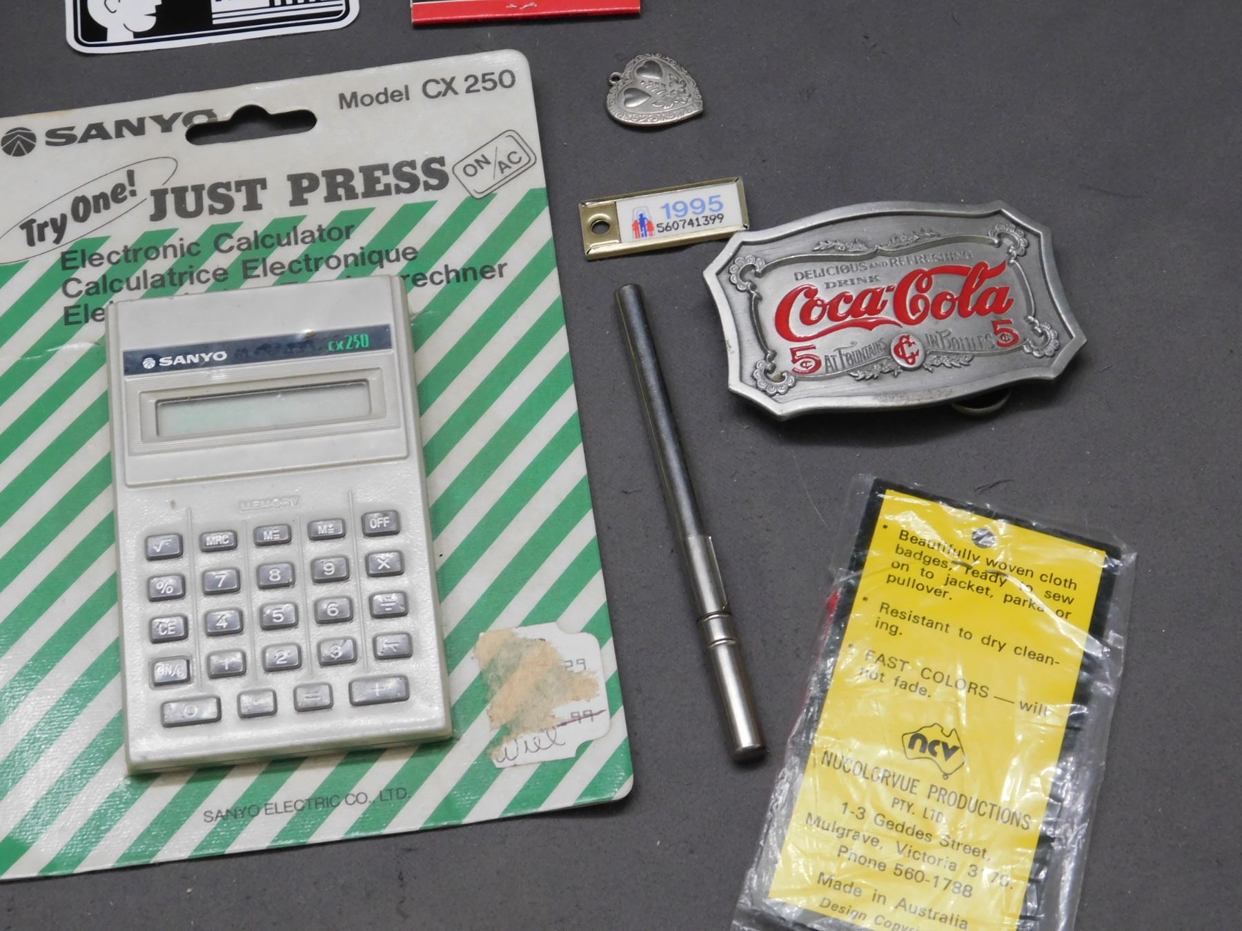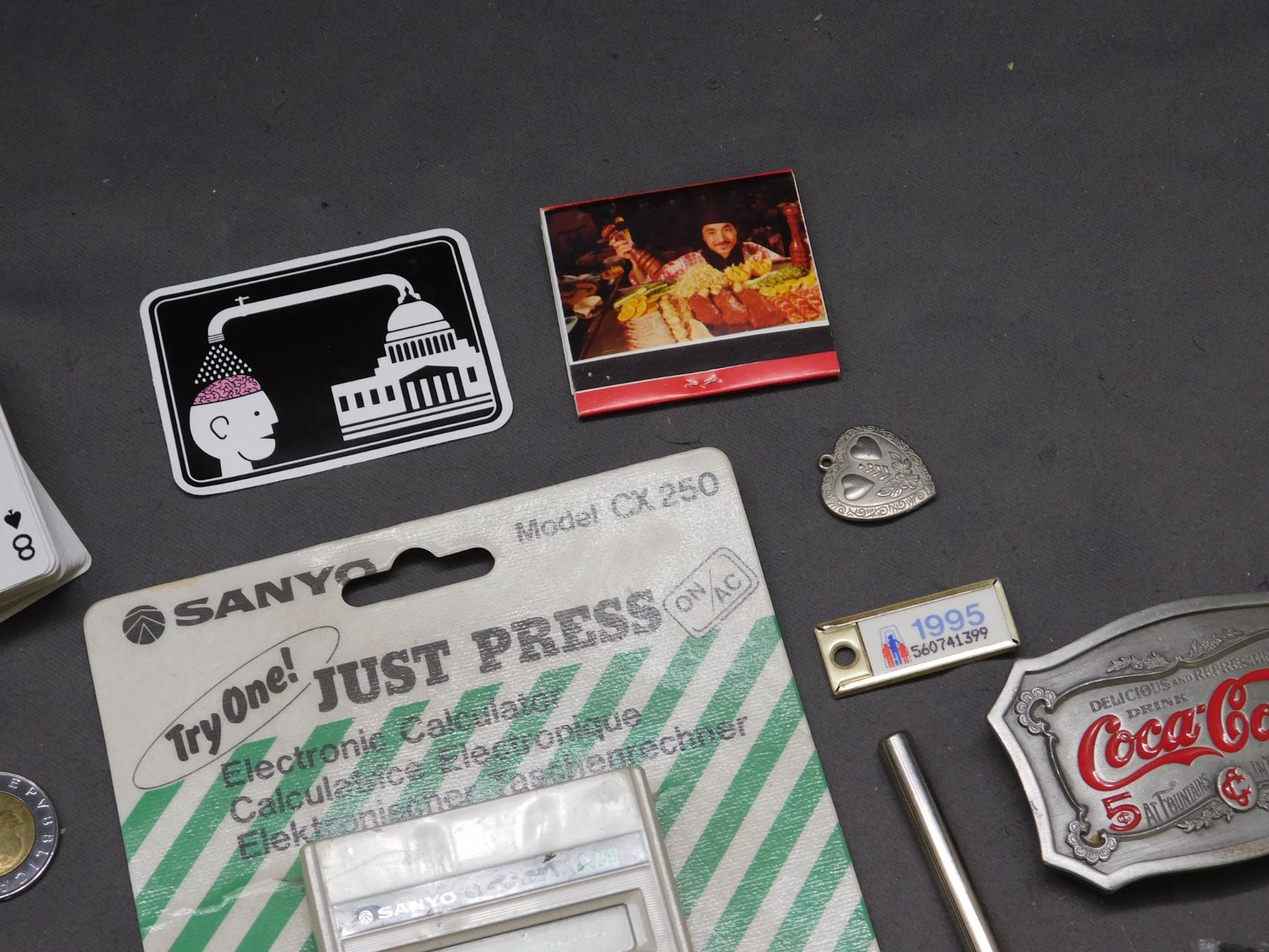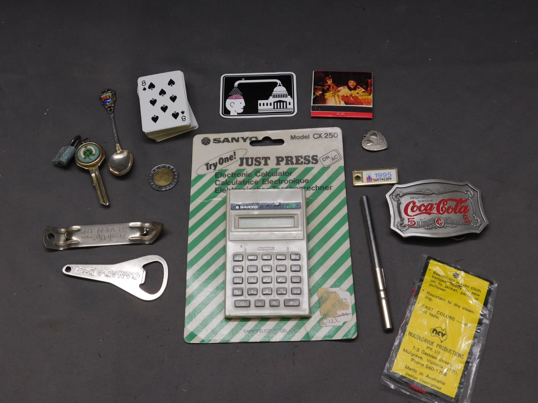 Junk Drawer Lot Mini Deck of Cards, Calculator, Matchbox, Coca Cola Belt Buckle, Bottle Openers