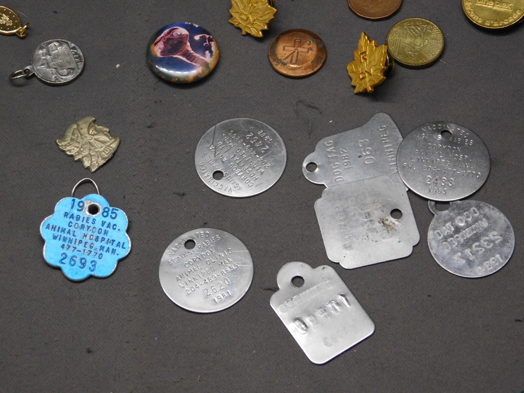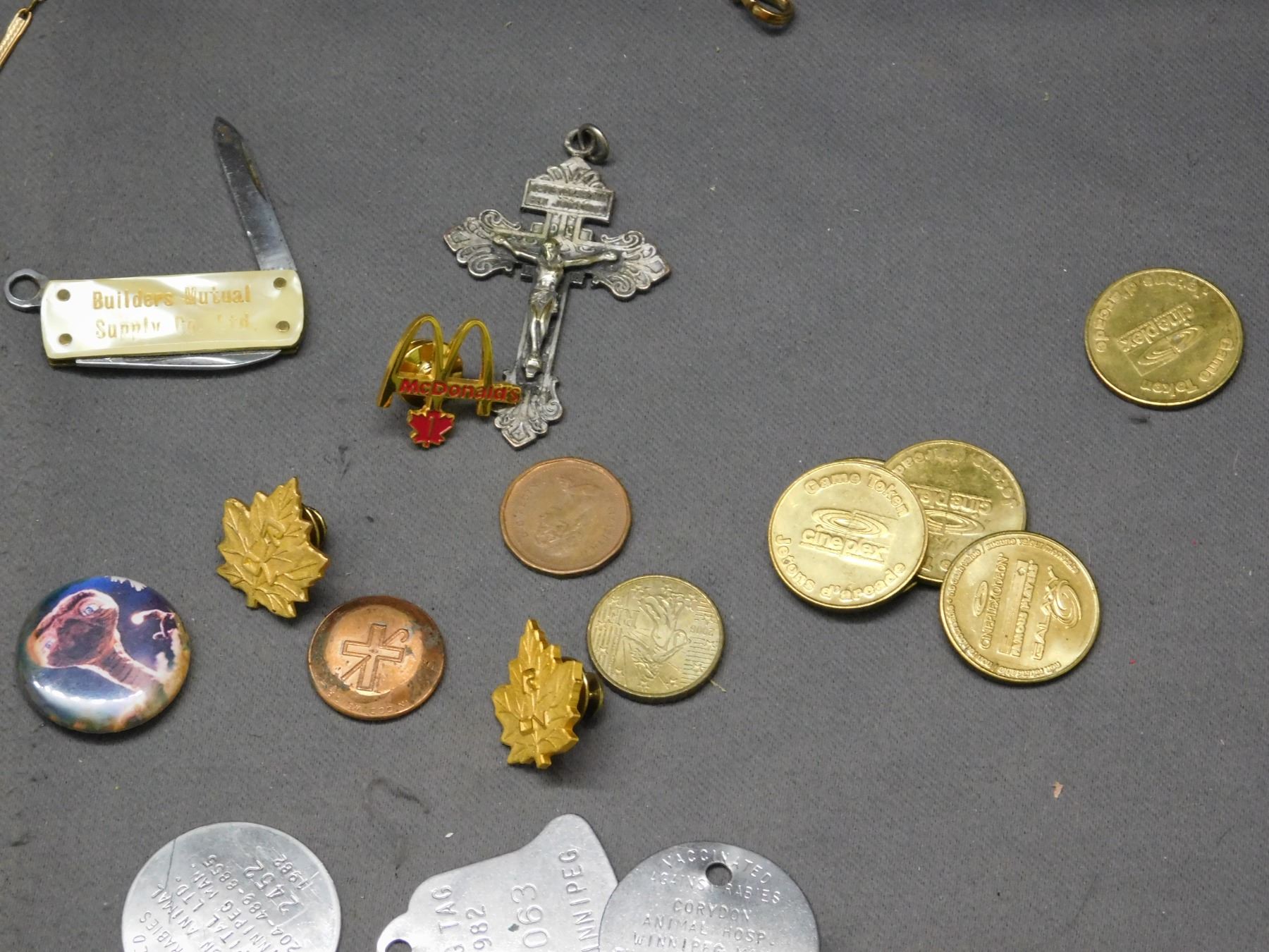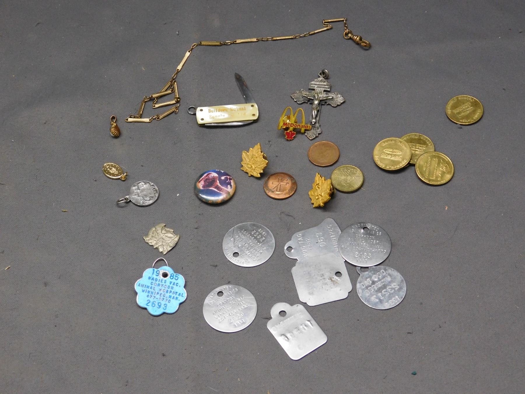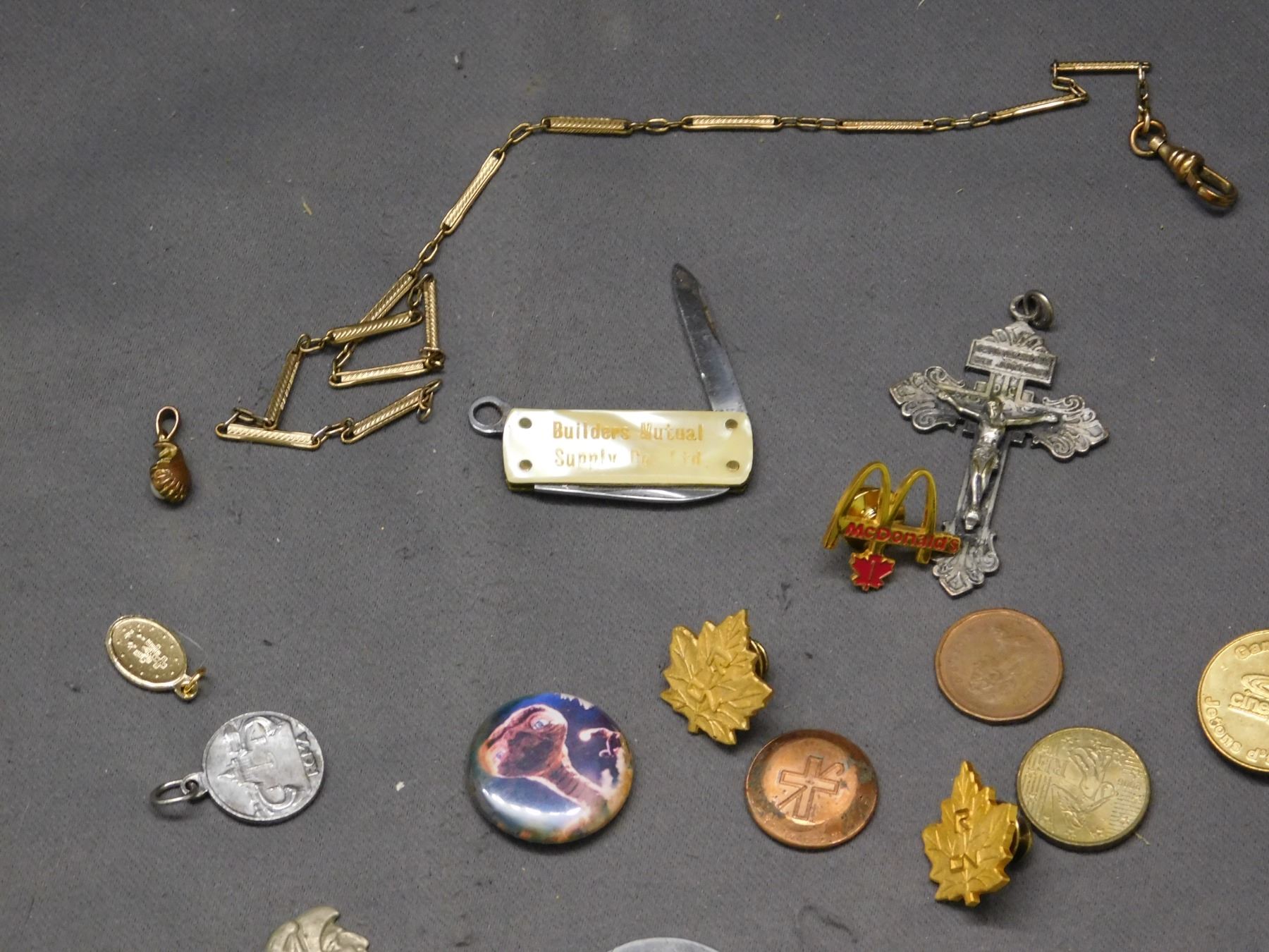 Junk Drawer Lot of Coins, Pen Knife, GF Pocket Watch Chain, Pins, 80s Dog Tags, Tokens, etc