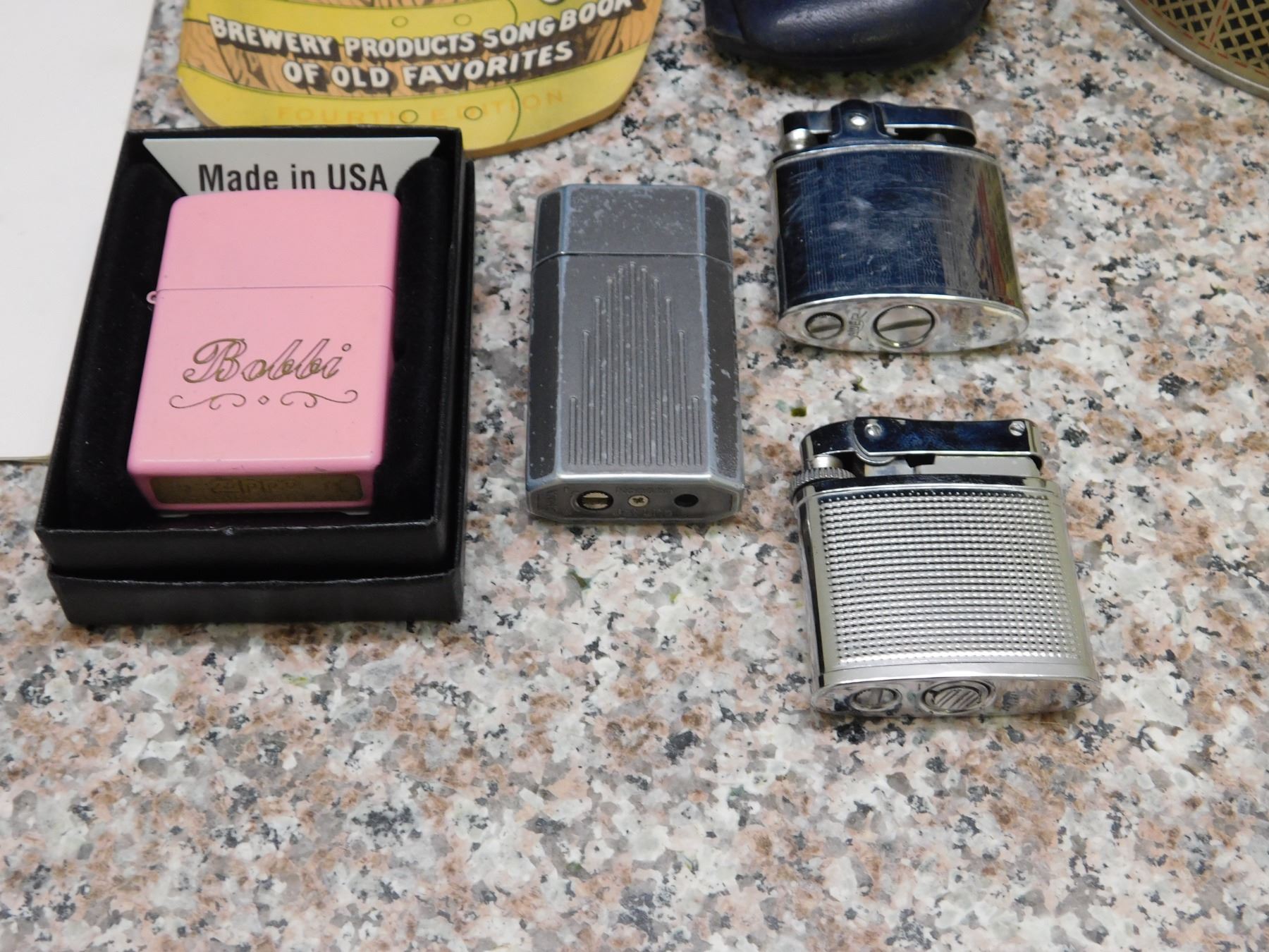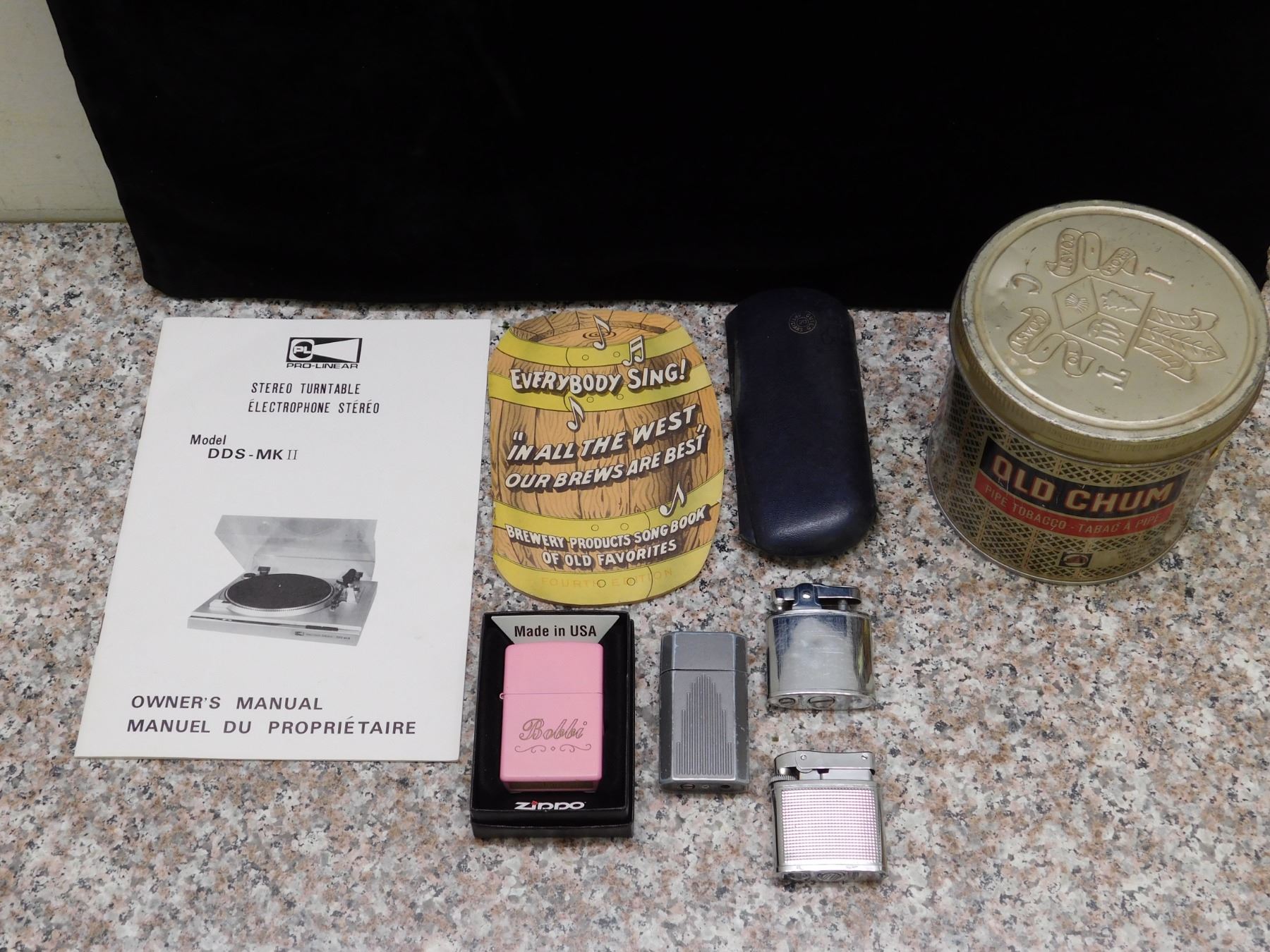 Junk Drawer of Lighters, Matte Pink, Tabacco Tin, Glasses, Turntable Manual, Songbook