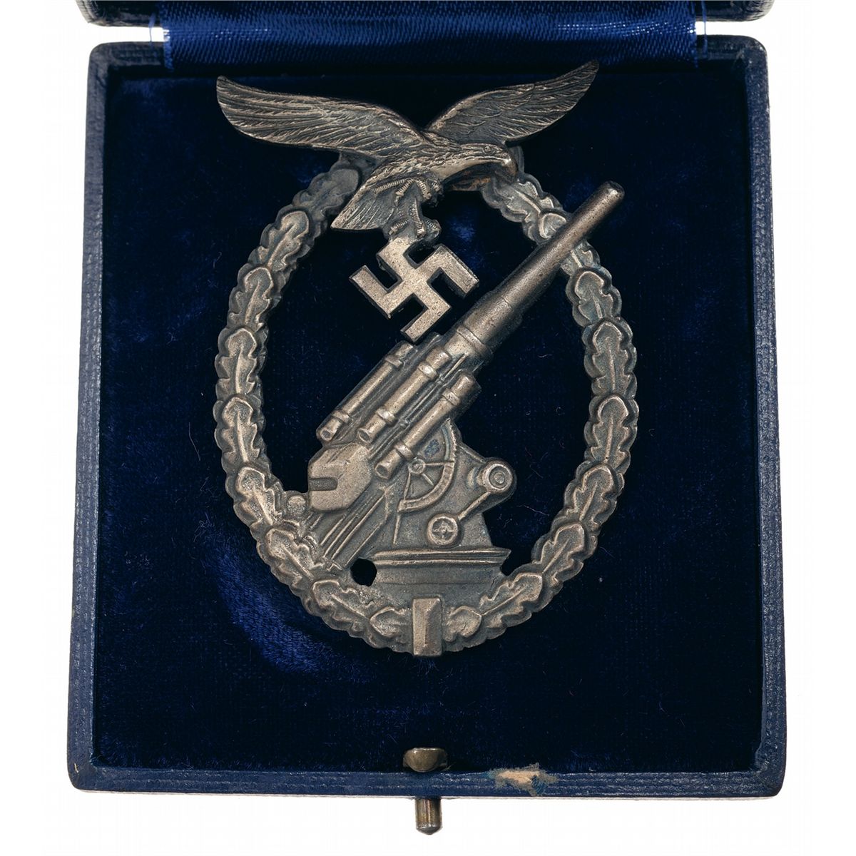 1 3/4 inches wide and 2 3/8 inches tall, with a Luftwaffe Eagle over an 88mm Flak gun, set in a wreath. With a needle pin on a barrel hinge and "C.E. JUNKER/ BERLIN SW". With a purple leatherette case, marked "Flak=/ Kampf=/ Ubz." in gold on the lid.