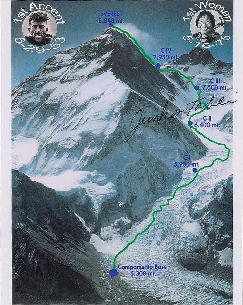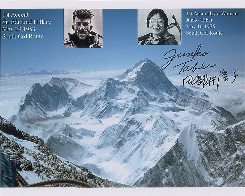 Two color glossy composite photos, 8 x 10 and 10 x 8, honoring Everest firsts, each signed by Tabei in black felt tip, one including her name in Japanese. In fine condition.