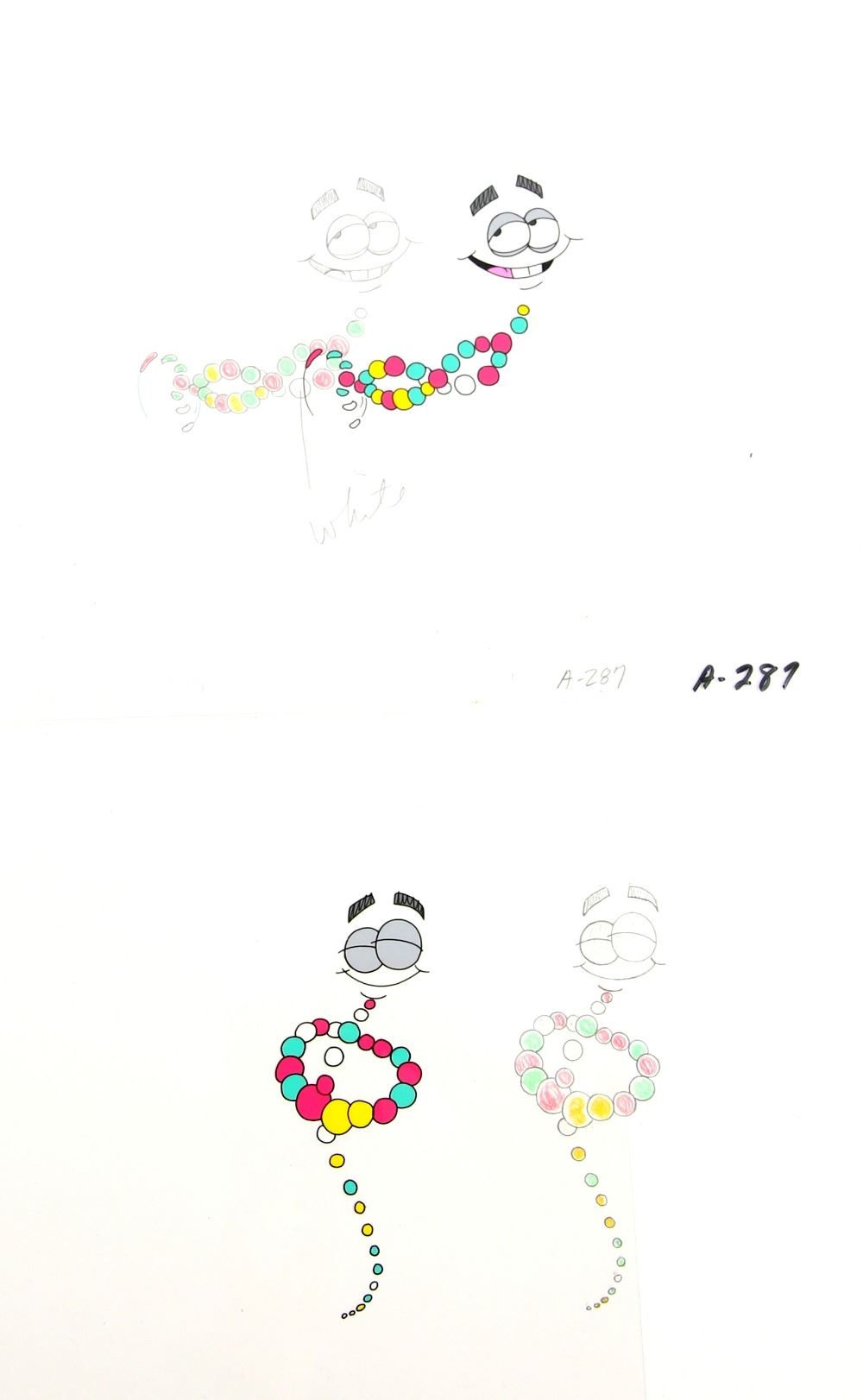 Jurassic Park (1993) Two original hand painted animation cels of Mr. DNA with pencil backgrounds, used in the sequence where the cartoon is played for the visitors of Jurassic Park, A-287 and A-363, 12.5 x 10.5 inches (2).Provenance: With Auction tag from Profiles In History. Lot 1021 Auction 47..
