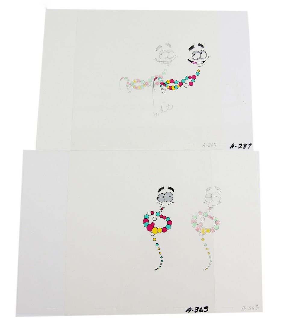 Jurassic Park (1993) Two original hand painted animation cels of Mr. DNA with pencil backgrounds, us