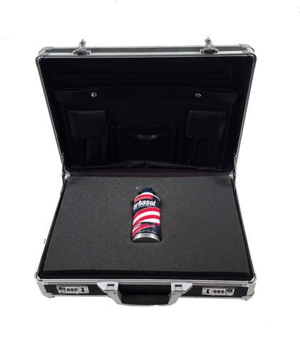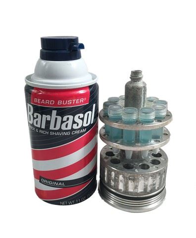 Jurassic Park (1993) - From the one of the biggest franchises of all time, is this signature precise replica "Barbasol" shaving can with detached vials enclosing the dinosaur eggs. This engineered replica is made of thin metal and plastic with the very recognizable 'Barbasol' shaving cream can with detached vials used to smuggle in the dinosaur embryos in a metal 'Vaultz' briefcase with numerical lock. (Shaving can approximately 6 1/2" tall and briefcase approx. 18" x 13")