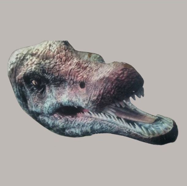 Stand in head featuring the likeness of a Spinosaurus used in the production of the 2001 film Jurassic Park 3. This piece is made of board covered in the likeness of the dinosaur and was used on set to interact with the actors, and was replaced by CGI in the final film. This piece remains in excellent, production used condition.