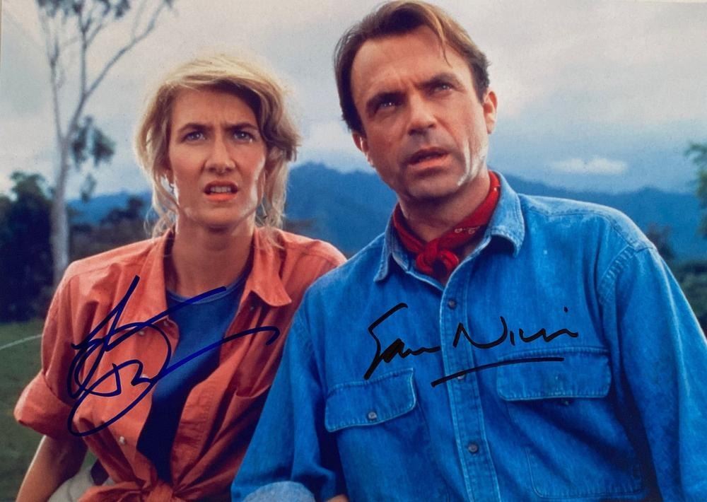 Jurassic Park Laura Dern and Sam Neill facsimile signed movie photo. 8x10 inches. This item is a reprint of an original autograph