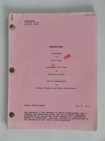 From the personal collection of legendary special effects artist and effects sculptor Yarke Alfer, this is his actual production script for "Jurassic Park" (1993), dated July 30th, 1992. it is the original multi-revision colored pages script with the productions security stamp on every page (JP 115). Alfer was the chief special effect sculptor on this classic Spielberg feature.