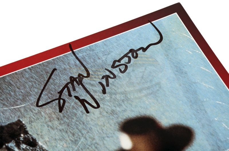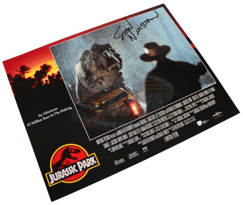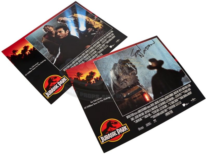 (Universal, 1993) This lobby card was printed at the time of the films release promoting the film. The lobby card features the image of the T-Rex attack and has been autographed by the legendary Visual Effects wizard Stan Winston. The lobby card is in very good condition and measures 11" x 14". Included with the signed lobby card is an unsigned card from the same set.