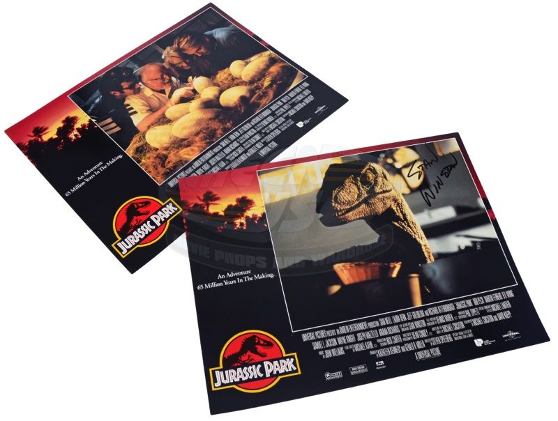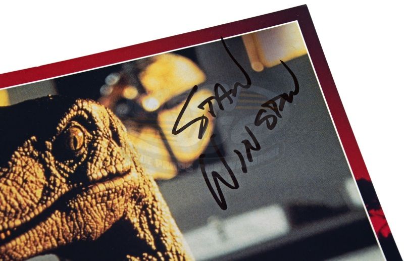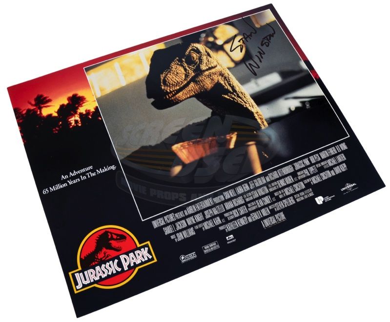 (Universal, 1993) This lobby card was printed at the time of the films release promoting the film. The lobby card features the image of a Velociraptor in the kitchen and has been autographed by the legendary Visual Effects wizard Stan Winston. The lobby card is in very good condition and measures 11" x 14". Included with the signed lobby card is an unsigned card from the same set.