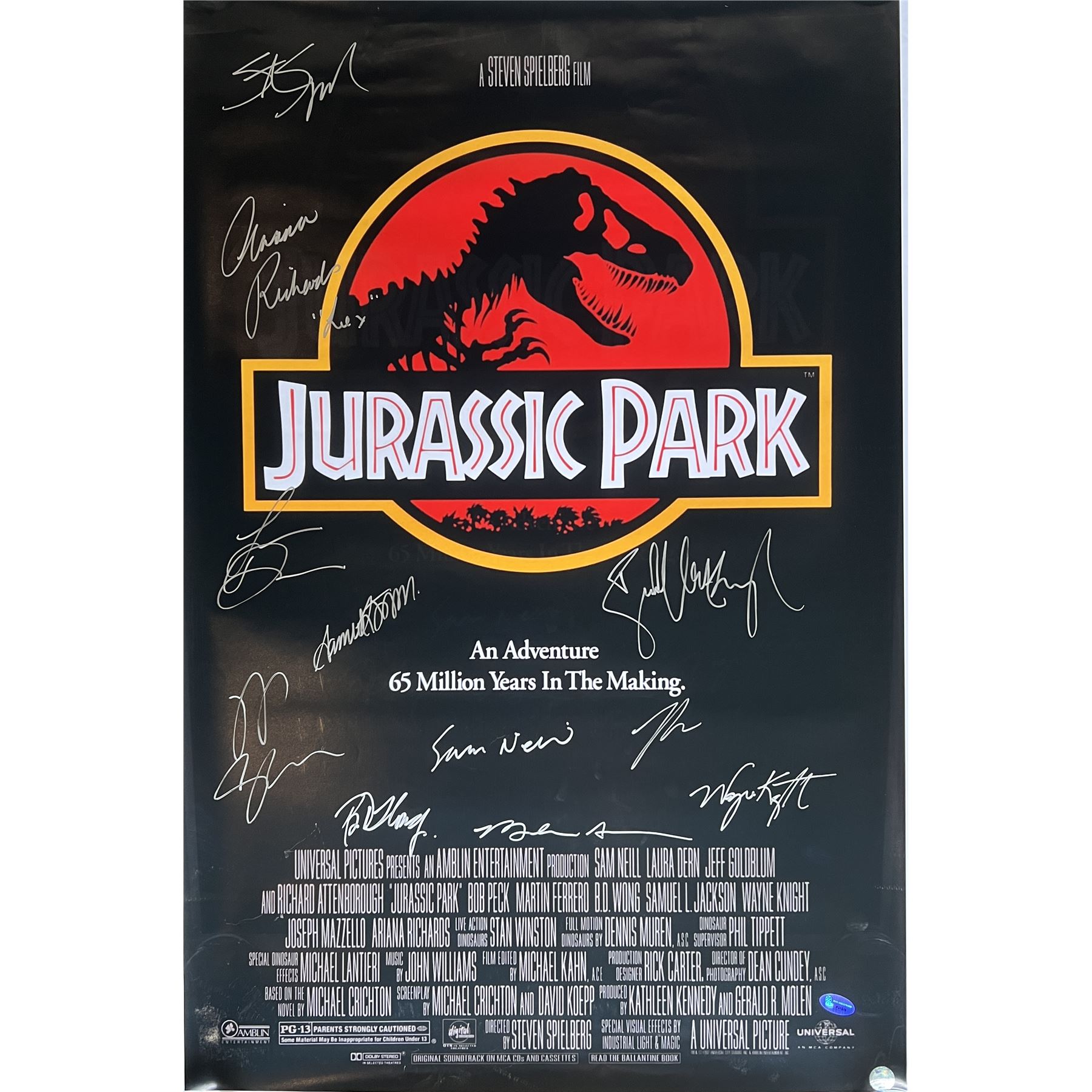 Jurassic Park cast signed movie poster autographed by B.D. Wong, Wayne Knight, Ariana Richards, Samuel L. Jackson, Jeff Goldbloom, Laura Dern, Richard Attenborough, Sam Neill, Miguel Sandoval, Joseph Mazzello and Steven Spielberg. GFA authenticated. 24x37 inches
