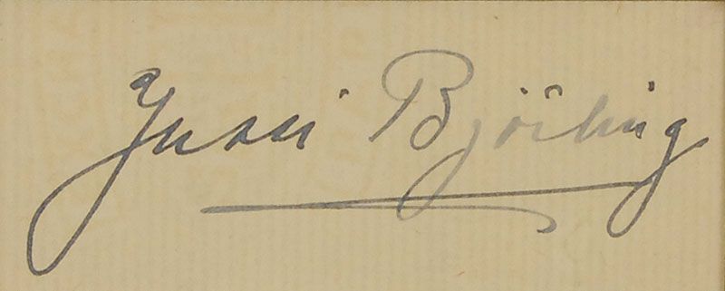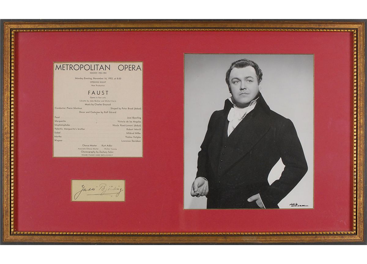 Much-lauded Swedish tenor (1911–1960) who was one of the most popular opera stars of his era. Fountain pen signature, “Jussi Bjorling,” on a light yellow slip. Matted and framed with a portrait of Bjorling and a program page from the Met’s production of Faust to an overall size of 21 x 13. In fine condition.