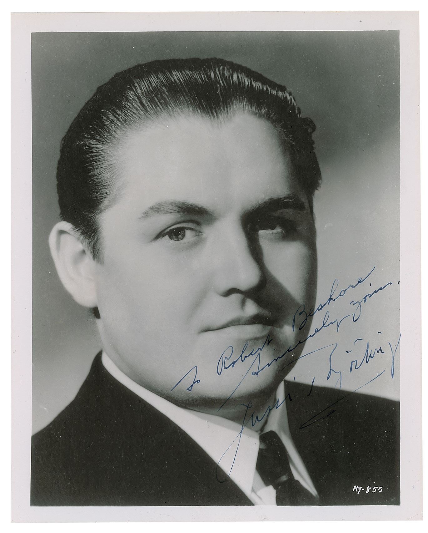 Vintage glossy 8 x 10 portrait of the acclaimed Swedish tenor, signed and inscribed in fountain pen, "To Robert Beshore, Sincerely yours, Jussi Bjorling.” In fine condition.