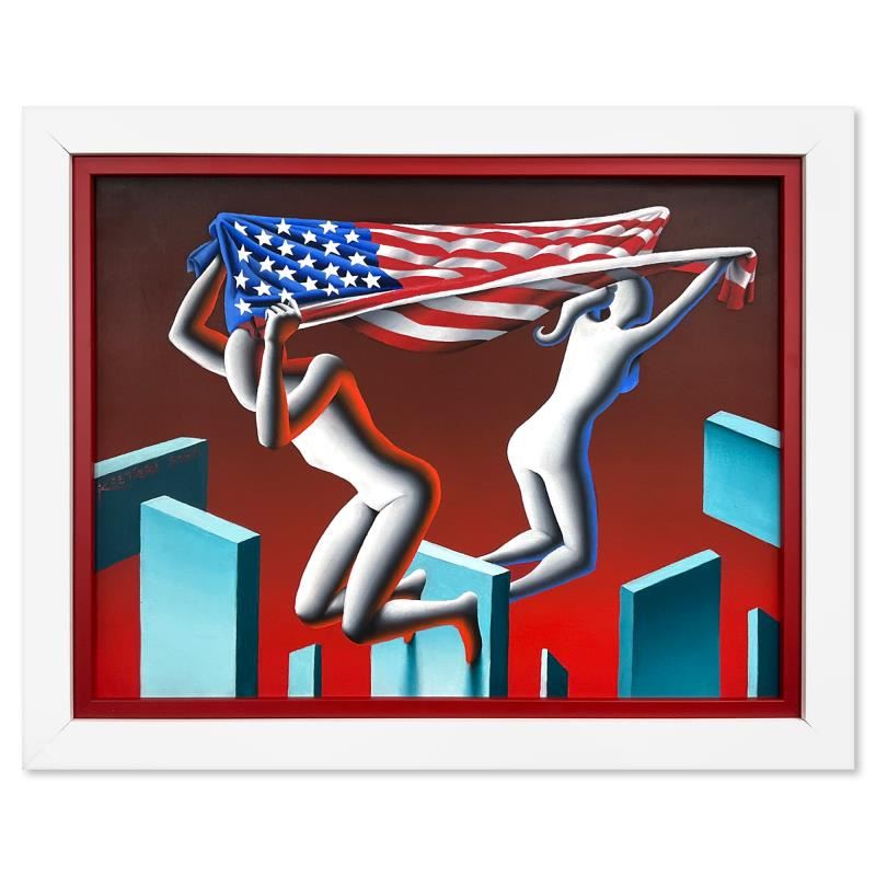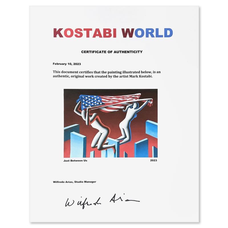"Just Between Us" is an original oil painting on canvas by Mark Kostabi, hand signed by the artist. This piece comes framed. Includes Letter of Authenticity. Measures approx. 27" x 21.5" (frame), 22.5" x 17" (image).