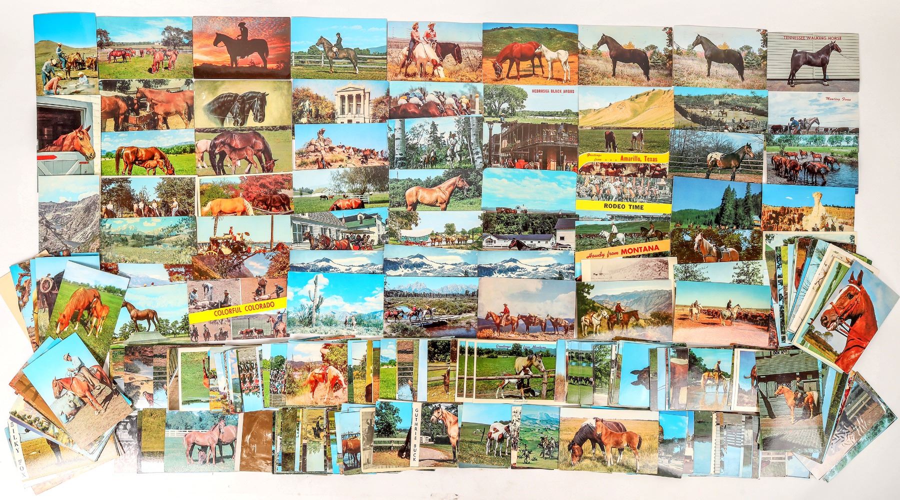 Lot of over 200.No RPC's. Mostly borderless, color. Some Wht borders and a few B/W and scalloped edge cards. Views : Horses in fields, next to ponds and rovers. Owners w/horses, pulling tourist wagons, rodeos, cattle round-ups, roping and more. NOT in protective sleeves, overall cond. is excellent. Of note :one card w/Chalk Beeson co-owner Long Branch saloon Dodge, Mounted Texas Ranger, 1894 I.O.O.F. parade Salida CO. and concept of the Crazy Horse Monument when complete. 1940's-60's Ken Prag Collection
