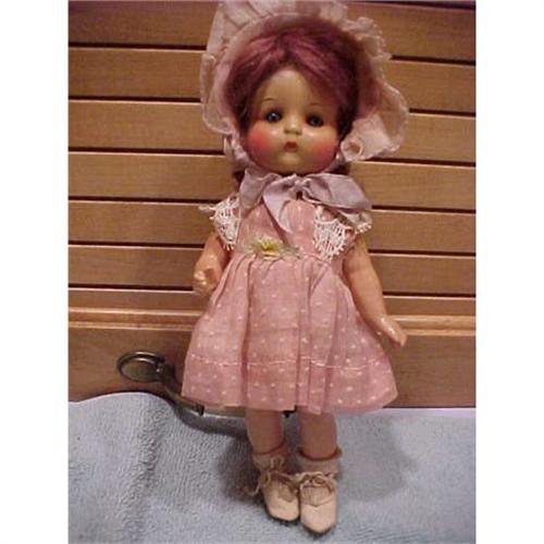 This Just Me is all original. She has never had her clothes off. She is painted bisque. The bisque head has some paint missing around the wig area and back of the neck where the markings are but this is typical of the doll. She has blue sleep eyes and a mohair wig. Her clothing is in remarkably good condition considering her age--no distracting stains and only one tiny hole in the back of her bonnet. The compo is typical quality for this doll but in good condition without repaint. The doll is about the best painted bisque Just Me I have ever had. She books for 1000.00 but my price is much less. Make an offer if not in an auction.
