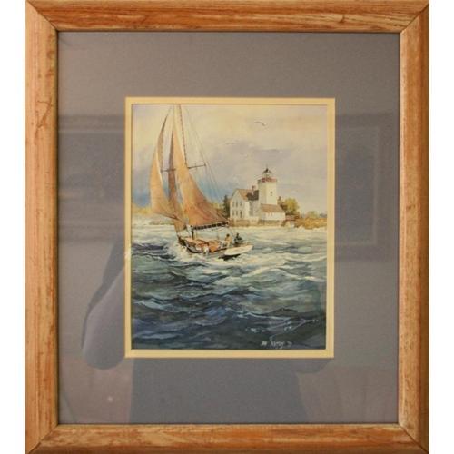 This vivid nautical scene captures both the elegance of an old-fashioned lighthouse and the majesty of a modern sailboat. Remarkable detail is shown throughout, from the riggings of the sails to the white tipped waves. Dark blue waters swirl upon the paper, bringing the picture to life. Featuring a double mat and a distressed, light oak frame, this picture?s overall size is 16.5? wide by 18.5? high, allowing it to fit into just about any space. This is a great buy for any lover of nautical scenes.