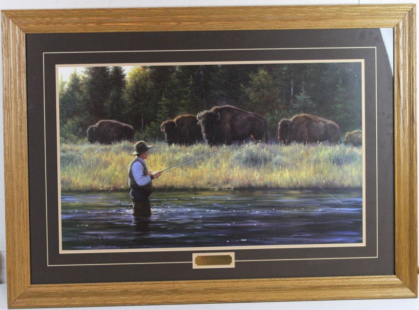"Just Passing By" by Robert Duncan - This is a print featuring a herd of Buffalo Passing a fly fisherman. Measures 30.5"x42.5"