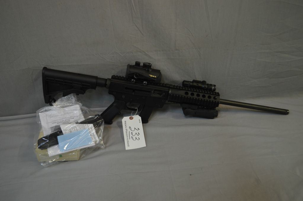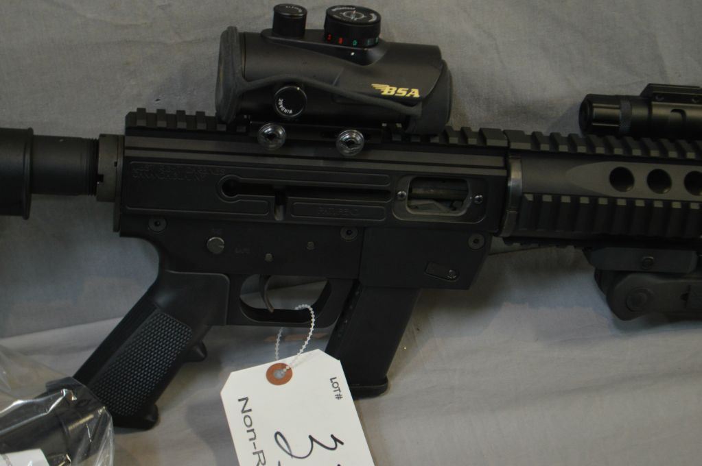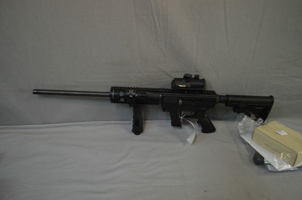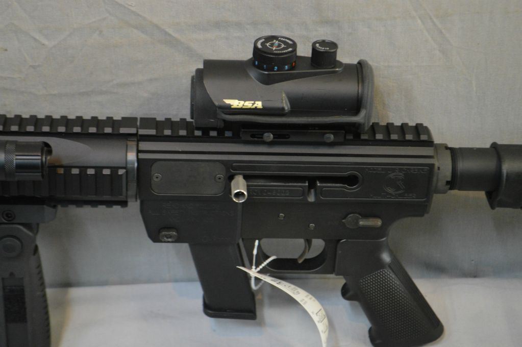 Just Right Carbines Model JR Carbine .9 MM Cal Semi Auto Rifle w/ 18 1/2" bbl [ black finish, with original box, instruction manual, composite pistol grip, Tapco collapsible butt stock, multi rail forend, w/ hand grip, w/ tactical Lazer sight, w/orig box, also BSA Shock Proof Fog Proof Water Proof Scope, exta pinned mag, for scope etc. ] Ser # JRC V048002 Non Restricted