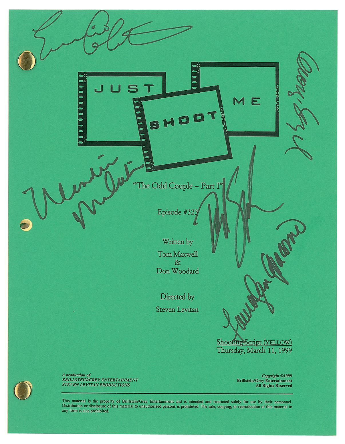 Brad-bound shooting script for the Just Shoot Me episode 'The Odd Couple: Part 1,' season three, episode 24, 48 pages, 8.5 x 11, dated March 11, 1999, signed on the front cover in black felt tip by Laura San Giacomo, George Segal, Wendie Malick, Enrico Colantoni, and David Spade. In fine condition.