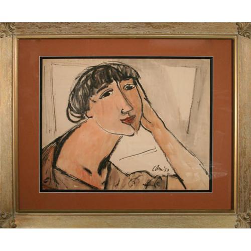 ?Just Thinking? is one of Cohn?s original watercolors and is a portrait painting that invites the viewers to form their own interpretations. Cohn employed the wet-on-wet technique to create this large amorphous composition. To work wet-on-wet the artist saturates the paper with water and applies the pigment to the wet surface allowing it to bleed into all other wet areas freely, mixing colors and creating interesting textures as in ?Just Thinking.? The artist?s use of gray, blue, peach, and black bleed into the background colors of gray and cream. There are also areas of brown to compliment the colder tones in the piece. This wonderfully fluid composition is complimented perfectly by the natural black with black core lower mat and spice colored top mat that it is mounted beneath. The painting is capped off by the beautiful antique gold with ornate corners frame, giving it a sophisticated and modern presentation and bringing the total measurements to 34?x 28?. It is truly a marvelous, affordably priced piece by a nationally renowned artist that would be a unique and eye-catching addition to any collection of fine art.