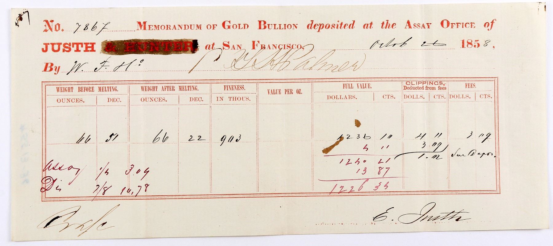 Justh, Assay Office and Gold and Silver Refinery, 104 Montgomery St., San Francisco, CA, October 26, 1858. No. 7867 Memorandum of Gold Bullion deposited by W.F. & Co. ñ C.T.H. Palmer. Weight before melting: 66.51 oz. After melting: 66.22. Fineness: .903. Full Value of Gold: $1236.10. Signed by E. Justh. Most of the existing certificates were signed for E. Justh by his employee Sidney Van Wyck who was an assayer previously employed by Justh, at the San Francisco Mint. Van Wyck later went on to become the sole assayer in the new mining camps of the post 1860 era of Aurora, Virginia City, and Hamilton. These certificates are particularly collectible because of their direct relationship to the Justh & Hunter gold ingots found on the 1857 wreck of the Steamer, S.S. Central America. Hillen Hunter (Crossed out) left Justh where he was in charge of the Marysville office. Very Fine condition. Low R6. Justh & Hunter Assay Office: Emanual (Emil) Justh was born in Verboca, Hungary and arrived in San Francisco on November 14, 1850. Initially he worked as a Lithographer in the office of Justh & Co. and Justh & Quirot. After working in the U.S. Assay Office from April of 1854, he partnered with S. (Solomon) Hillen Hunter shortly after he arrived in San Francisco early in in 1855. The Assay office was formed on May 15, 1855, and located on 188 Montgomery Street. On July 10, 1858, Justh was no longer in partnership with Hunter who had left, which explains why Hunters name was blacked out on most of the Justh & Hunter receipts. Perhaps only one example of However the altered receipts remained in use by Justh until he required a new supply for business sometime later. It was then that Justh simply changed the design and size of his receipts and deleted Hunters name altogether. These receipts are significantly larger, measuring 10.5 x 4.25 inches and were printed on a creme or buff colored paper with black ink by Kuchel & Dresels Lithography SF. In addition to columns listing weights before and after melting, fineness, fees, and full value, a new column was added by Justh for ìClippings / deducted from Fees / Ozs / Dec / Dolls / Cts. Justh & Hunter Assay Office. On May 2, 1856, Justh opened a branch office in Marysville. On October 12, 1856, the San Francisco branch moved to 108 Battery St., corner of Merchant. On May 30, 1857, Haraszthy sold the Eureka Refinery (Later called the ëthe Gold and Silver Refinery described in the 1859 California State Register and Year Book of Facts, p. 303) located on the corner of Brannan and Harris, (which he opened just a few months earlier on March 14, 1857) to Justh & Hunter just prior to Hunters leaving the company. On March 31, 1859, Justh sold out his Marysville operations to Theall & Co. Later that spring Justh moved his remaining San Francisco branch again to 104 Montgomery St. opposite Wells Fargo & Co. He later leased the operation to Duncan, Sherman & Co., a well-known N.Y. banking firm, on March 1, 1860, with Justh continuing as assayer and Robert Burnett as cashier. This arrangement lasted until December of that year when Justh took over once again from Duncan, Sherman. During this timeframe S. (Sydney) M. Van Wyck had joined the firm. Five months later Justh sold out to Kellogg & Hewston. Later that year Justh left for New York where he became a stockbroker and banker. E. Justh died in Paris in December of 1883. References: Holabird-Kagin Americanas The Rush for Gold Catalog Summer 2008; California Coiners and Assayers by Dan Owens 2000; 1856 San Francisco Directory ñ Harris, Bogardus & Labatt, p. 69. Size: 10 x 4.25 inches. San Francisco California 1858