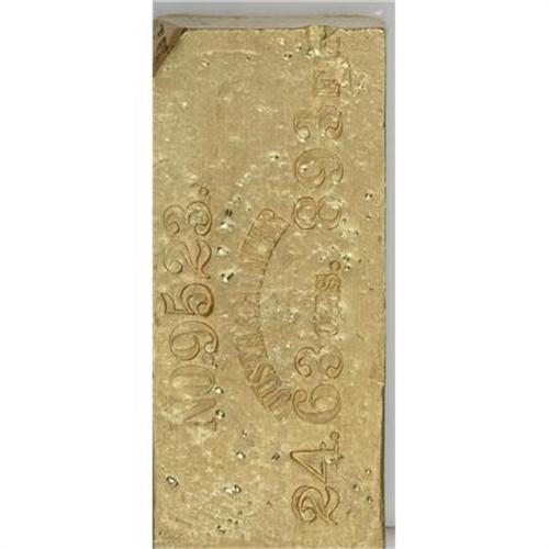 <B>Justh & Hunter Gold Ingot.</B></I> No. 9523. The top side reads NO. 9523 / JUSTH & HUNTER (imprint) / 24.63 OZS. 893 FIN(E). The assayer's cut is evident on the top right of this side also. The adjacent, long side gives the only other imprint, the 1857 value of $454.66. The firm of Justh & Hunter is one of great stories among territorial assayers. Born in Hungary and a follower of Kossuth, Emil Justh arrived in San Francisco on November 14, 1850. Upon arrival, he founded a lithographic firm, then became a Ship and Customs House Broker. He then became an Assistant Assayer at the newly opened San Francisco mint. Then in early 1855, he and Solomon Hillen Hunter formed a partnership as assayers of "Gold, Silver, and Ores of every description." As an interesting sidenote, Hunter took passage to San Francisco via Panama on the <I>S.S. George Law.</B></I> That ship was later renamed the <I>S.S. Central America,</B></I> the treasure ship that sank in a hurricane on September 12, 1857, and the same ship this ingot was recovered from. In 1856 Justh and Hunter opened a branch office in Marysville. The firm added another partner, Charles Uznay, but the firm dissolved the partnership on August 17, 1857. One would think that would be the end of the story of Emil Justh, but the truly interesting part will be discussed under the 144 ounce ingot, which will be the next lot.<BR> The ingot shows even yellow-gold coloration, apparently having a high silver content of the 10.7% of the ingot that is not gold. Only the usual small marks and gas bubbles from manufacture are noted on the surfaces.<I>Accompanied by a copy of</B></I> A Gold Rush History, <I>by Q. David Bowers.</B></I><BR><I>From The Groth Family Collection.</B></I>