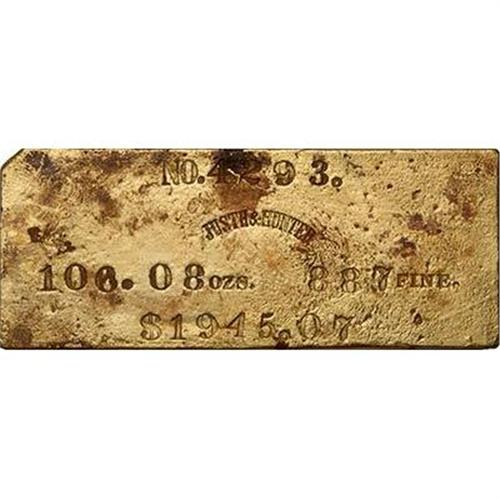 This is a large Justh & Hunter gold bar stamped 106.08 ounces, 887 Fine, and valued at $1945.07. Serial No. 4293, one of the recovered bars from the shipwreck of the S. S. Central America and an historic item from the California gold rush period.