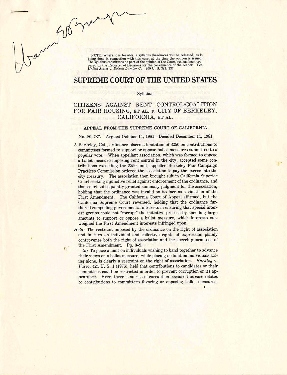 Burger signed Supreme Court decision ''Citizens Against Rent Control…v. City of Berkeley, California…'' Stapled document includes 2pp. syllabus and 9pp. decision. Boldly signed ''Warren E. Burger'' at top of first page of syllabus. This 1981 opinion addressed a Berkeley ordinance limiting contributions to committees formed in support of ballot measures to $250. Writing for the majority, Chief Justice Burger held such a restraint was a violation of the First Amendment. Minimal toning. An excellent Court memento in near fine condition.
