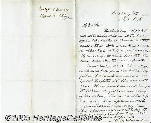 <B>Justice David Davis Autograph Letter Signed</B></I> Signed, "David Davis," as Associate Justice, one page, 5" x 8". Washington, March 18, (1872). (To New York lawyer E. W. Stoughton). In full: "The clerk says 147 & 148 will not be reached until about the 1st of April - Judge Curtis is I believe in the cases with you - & he is now here & will doubtless keep watch and advise you. By the end of the week, I shd think, I an learn something more definite. I want to see you & will defer my talk until I see you - Our Hotel has fallen off & I can't recommend it for Mrs Stoughton shd she come with you. Please present me most kindly to Mrs S - Do you hear any change of Judge Nelson? I have no hope of ever seeing him again in Washington. I hope his life may be spared for many years & with health enough to enjoy the Society of his family & friends." Docketed on verso, probably by Stoughton: "Judge Davis / March 18/72." Davis, appointed by his friend Abraham Lincoln in 1862, resigned from the Court in 1877 to become U.S. Senator from Illinois. Fine condition. <I>Accompanied by COA from PSA/DNA.</B></I>