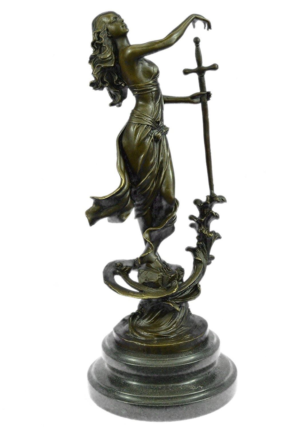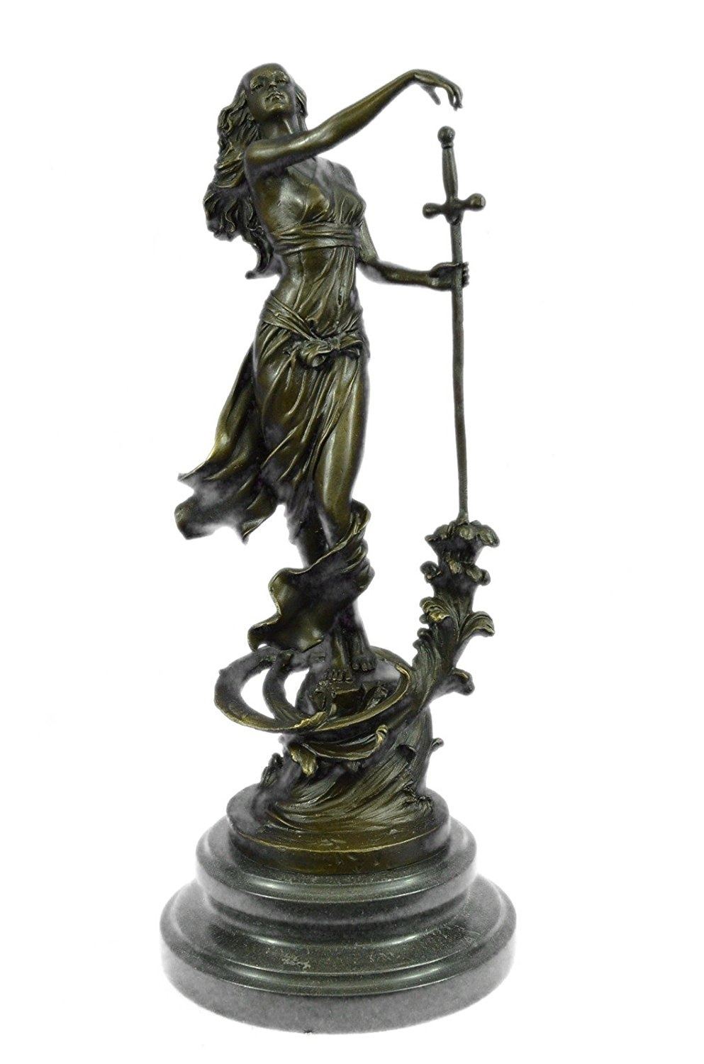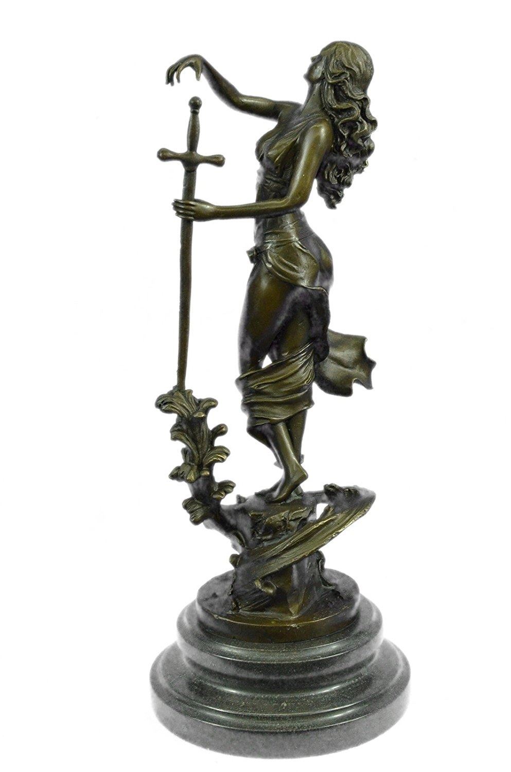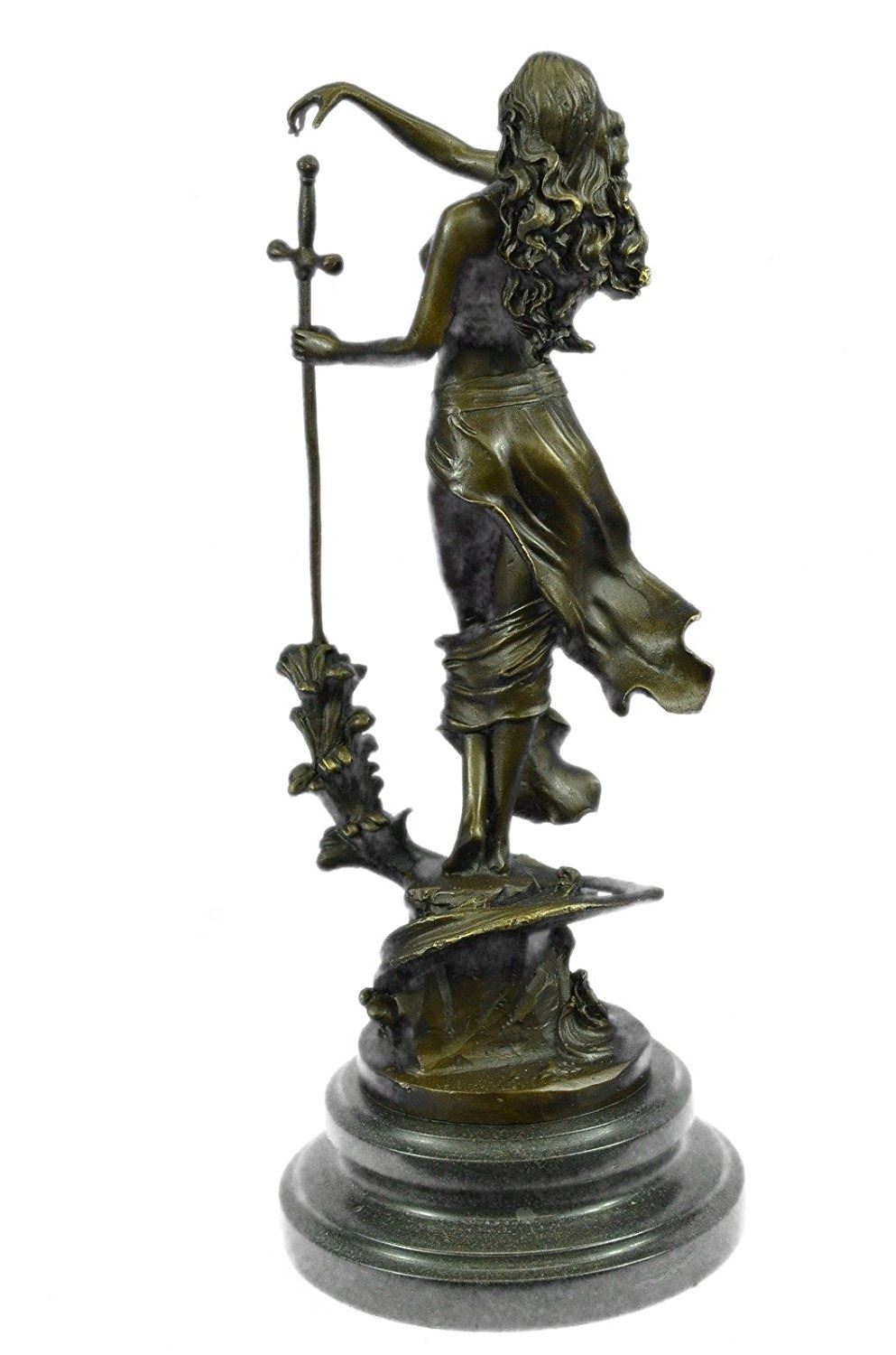The beautiful woman stands upon a rock in contraption position with flowing robes that are obedient to the changing winds. Her long curly locks rustles backwards from the gusts of air. Her left hand holds a sword downward as her suspended right arm moves to turn the sword upright. Fine details, as seen in her robe and hair, displays the artists skilled mastery. She was molded using the age-old method of lost-wax casting and stained with brown patina tarnish. She is mounted upon a black marble base. Bronze Dimensions with Marble Base: Height 14 X Width 8 inches. Weight: 9 LBS. Inventory: 65ST0024556