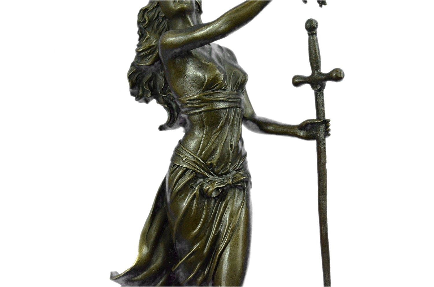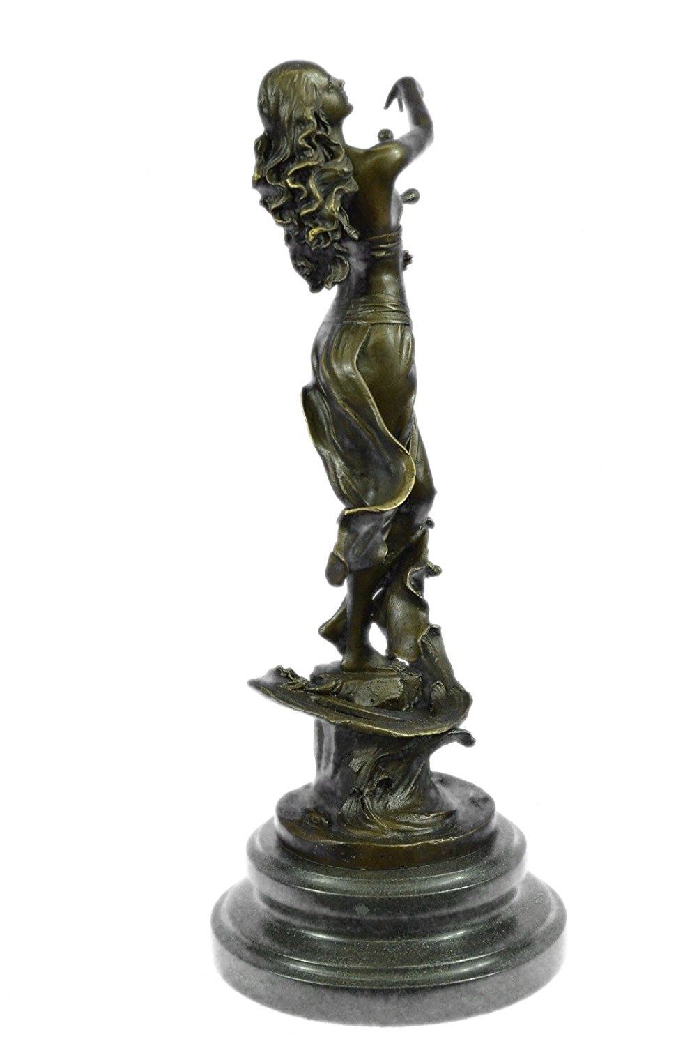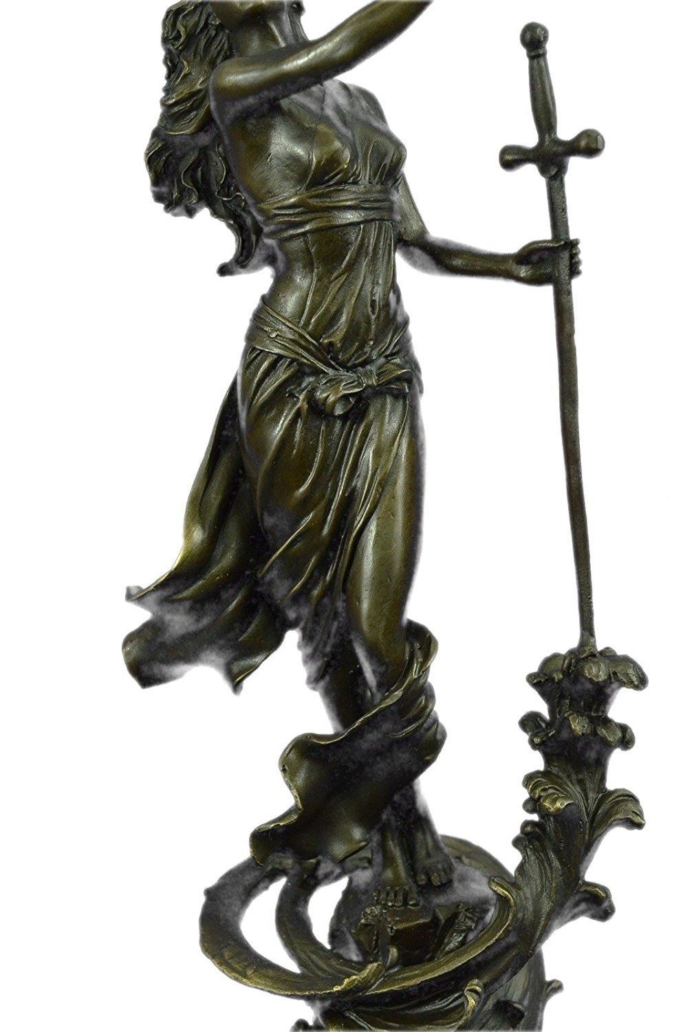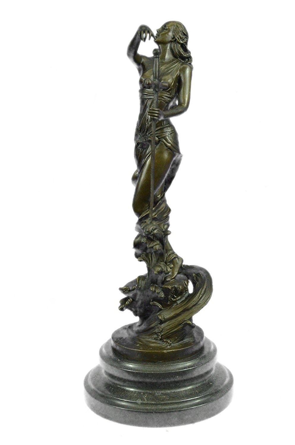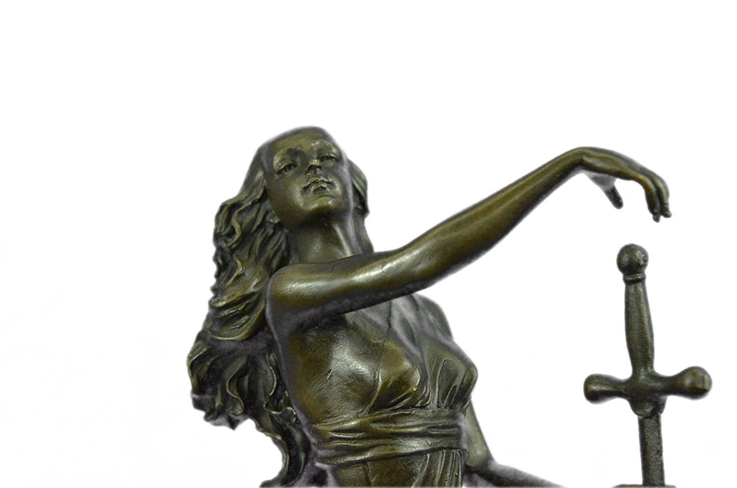 The beautiful woman stands upon a rock in contraption position with flowing robes that are obedient to the changing winds. Her long curly locks rustles backwards from the gusts of air. Her left hand holds a sword downward as her suspended right arm moves to turn the sword upright. Fine details, as seen in her robe and hair, displays the artists skilled mastery. She was molded using the age-old method of lost-wax casting and stained with brown patina tarnish. She is mounted upon a black marble base. Bronze Dimensions with Marble Base: Height 14 X Width 8 inches. Weight: 9 LBS. Inventory: 65ST0024556