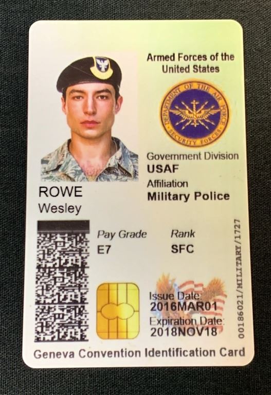 Original Wesley Rowe Military I.D used by "The Flash", played by Ezra Miller in the superhero film "Justice League" (2017) where, fueled by his restored faith in humanity and inspired by Superman's selfless act, Bruce Wayne enlists the help of his new-found ally, Diana Prince, to face an even greater enemy. The film is directed by Zack Snyder, written by Chris Terrio and Joss Whedon, and features an ensemble cast that includes Ben Affleck, Henry Cavill, Gal Gadot, Ezra Miller, Jason Momoa, Ray Fisher, Amy Adams, Jeremy Irons, Diane Lane, Connie Nielsen, and J. K. Simmons. In the film, Batman and Wonder Woman recruit The Flash, Aquaman, and Cyborg after Superman's death to save the world from the catastrophic threat of Steppenwolf and his army of Parademons.