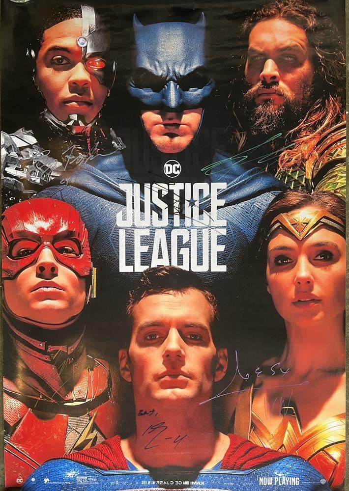 Justice League cast signed movie poster autographed by Henry Cavill, Gal Gadot, Jason Momoa, Ben Affleck, Ezra Miller and Ray Fisher. 24x37 inches