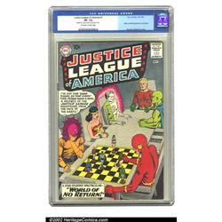 Justice League of America #1 (DC, 1960) CGC VF- 7.5 Off-white to white pages. Featuring one of DC's classic Silver Age covers, the JLA play a deadly game of chess with Despero, with each move causing another member to disappear into thin air. JLA would directly influence the creation of the Fantastic Four, thanks to its quick success in the market. This copy displays well, exhibiting only minor imperfections; the most noticeable is a chip off of the back cover corner. Overstreet 2002 VF 8.0 value = $2,500. Important notice: We expect to be auctioning lots at the rate of 200-250 per hour. Sometimes eBay Premier live bid software cannot keep up with that pace, so we strongly recommend that you place a realistic proxy bid now as insurance to avoid disappointment. Also please note that all Heritage/CAA lots purchased through eBay Premier carry a 20% Buyer's Premium. Please make sure you read the Terms and Conditions.