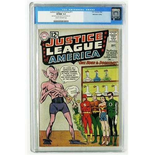 <B>Justice League of America #11 Mohawk Valley pedigree (DC, 1962) CGC VF/NM 9.0 Cream to off-white pages.</B></I> The JLA battles the Lord of Time. Mike Sekowsky cover and art. CGC notes, "Light tanning (on) edges (of) interior front and back cover." Overstreet 2006 VF/NM 9.0 value = $257; NM- 9.2 value = $350. CGC census 3/06: 5 in 9.0, 6 higher.