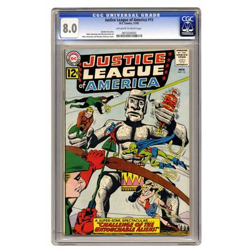 <B>Justice League of America #15 (DC, 1962) CGC VF 8.0 Off-white to white pages.</B></I> Mike Sekowsky and Murphy Anderson cover. Sekowsky and Bernard Sachs art. Overstreet 2005 VF 8.0 value = $158. CGC census 12/05: 6 in 8.0, 23 higher.