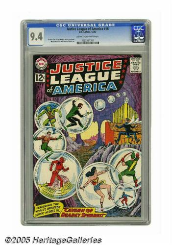 <B>Justice League of America #16 (DC, 1962) CGC NM 9.4 Cream to off-white pages.</B></I> The JLA take on the Maestro and find themselves in deadly peril... but it all turns out to be an imaginary story cooked up by a fanboy named Jerry Thomas (based on superfans -- then and now -- Jerry Bails and Roy Thomas). But the characters come up with an imaginary solution to the imaginary fix. The book has a Murphy Anderson cover and Mike Sekowsky art. Overstreet 2005 NM- 9.2 value = $280. CGC census 1/05: 2 in 9.4, none higher.