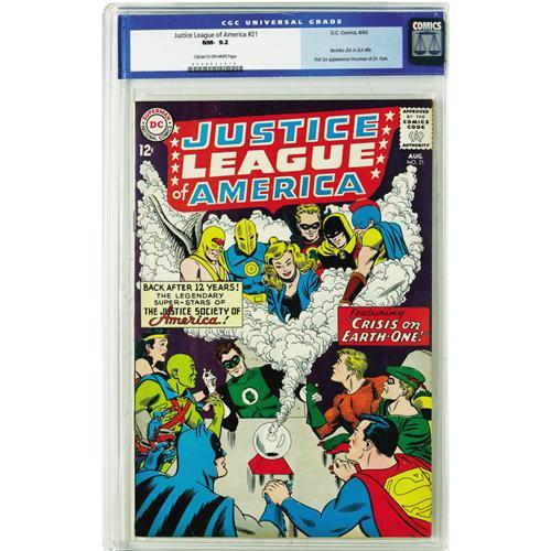 <B>Justice League of America #21 (DC, 1963) CGC NM- 9.2 Cream to off-white pages.</B></I> This is a key issue for Golden and Silver Age fans alike! That's because it's got the return of comics' first super-team, the Justice Society. Not only that, it's the first time the terms "Earth-One" and "Earth-Two" appeared in a comic, and it was the first of the many "Crisis..." stories teaming up the JLA and JSA. Mike Sekowsky was charged with drawing the whole slew of characters. Overstreet 2006 NM- 9.2 value = $575. CGC census 4/06: 6 in 9.2, 8 higher.
