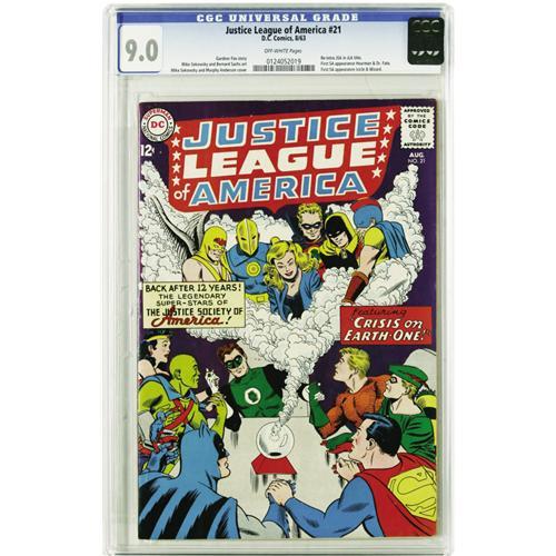<B>Justice League of America #21 (DC, 1963) CGC VF/NM 9.0 Off-white pages.</B></I> The terms "Earth-One" and "Earth-Two" appeared in a comic for the first time here, and the book's got the return of the Golden Age's greatest superteam, the Justice Society! This issue's "Crisis on Earth-One" was the first of the many "Crisis..." stories teaming up the JLA and JSA, that makes it a must for Golden Age and Silver Age fans alike. Mike Sekowsky provided the art for the cover as well as the key story. Overstreet 2006 VF/NM 9.0 value = $415; NM- 9.2 value = $575. CGC census 3/06: 4 in 9.0, 14 higher.